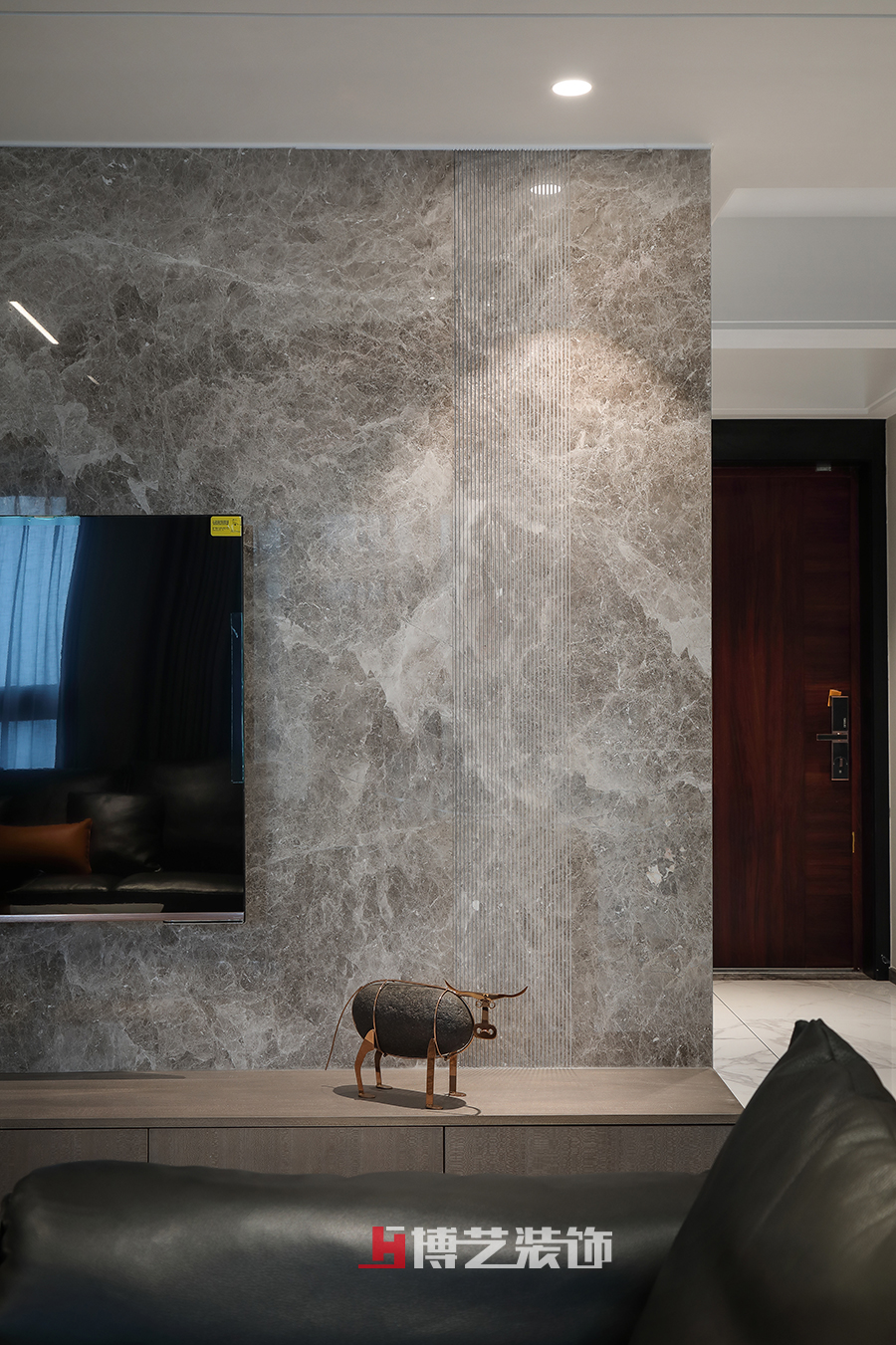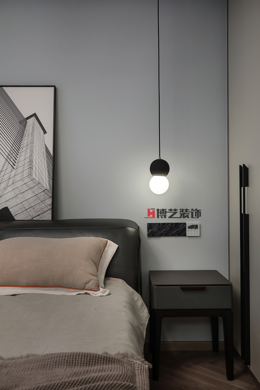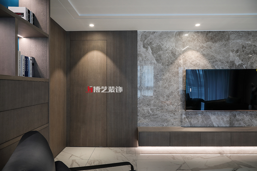 設(shè)計理念: 本案的亮點之處在于隱形門的設(shè)計。設(shè)計師打破常規(guī)門高的設(shè)計,呈現(xiàn)出了一套隱形通頂門的效果,使得整體看上去大氣而整體。吊頂上面沒有過多的設(shè)計層次,呈現(xiàn)的是一種簡約而不簡單的設(shè)計,保持所有事物該有的本真效果。整體采用大量的木飾面與同色系柜體相結(jié)合的形式,給人一種視覺上相融合的感覺。而電視背景的設(shè)計上,設(shè)計師采用了線條抽縫的設(shè)計效果增加了整體空間的層次感。也體現(xiàn)了設(shè)計師對于現(xiàn)代風格的獨到見解。