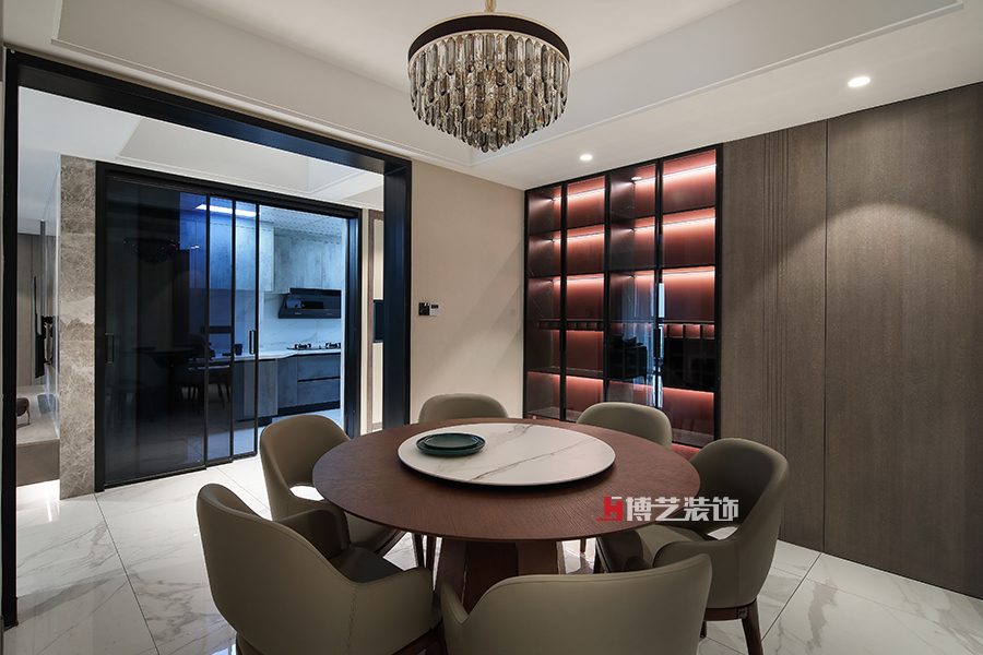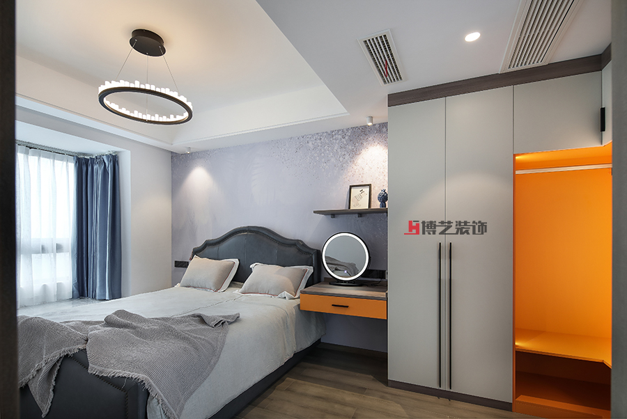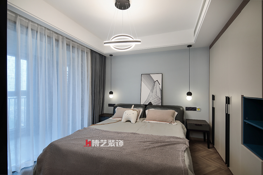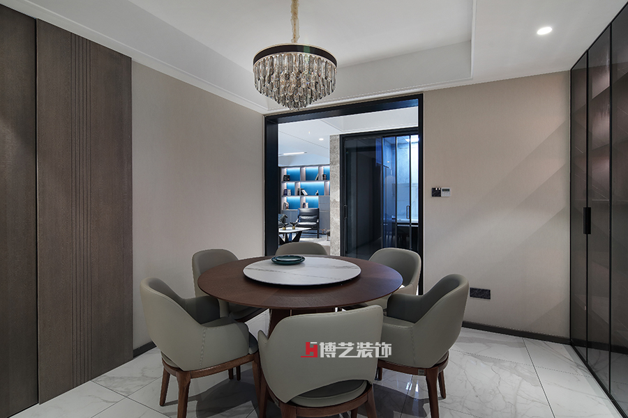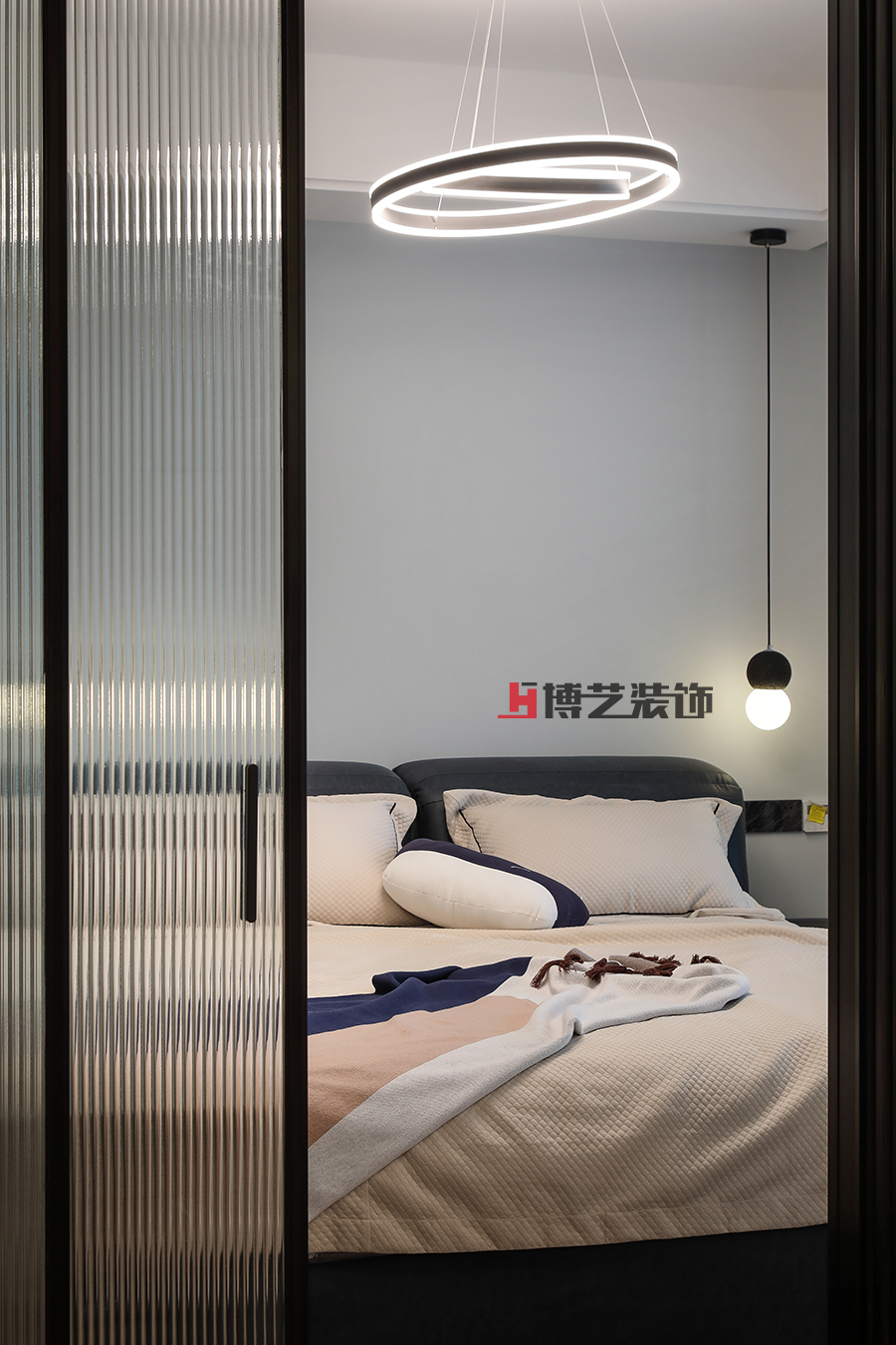 設(shè)計理念: 本案的亮點之處在于隱形門的設(shè)計。設(shè)計師打破常規(guī)門高的設(shè)計,呈現(xiàn)出了一套隱形通頂門的效果,使得整體看上去大氣而整體。吊頂上面沒有過多的設(shè)計層次,呈現(xiàn)的是一種簡約而不簡單的設(shè)計,保持所有事物該有的本真效果。整體采用大量的木飾面與同色系柜體相結(jié)合的形式,給人一種視覺上相融合的感覺。而電視背景的設(shè)計上,設(shè)計師采用了線條抽縫的設(shè)計效果增加了整體空間的層次感。也體現(xiàn)了設(shè)計師對于現(xiàn)代風格的獨到見解。