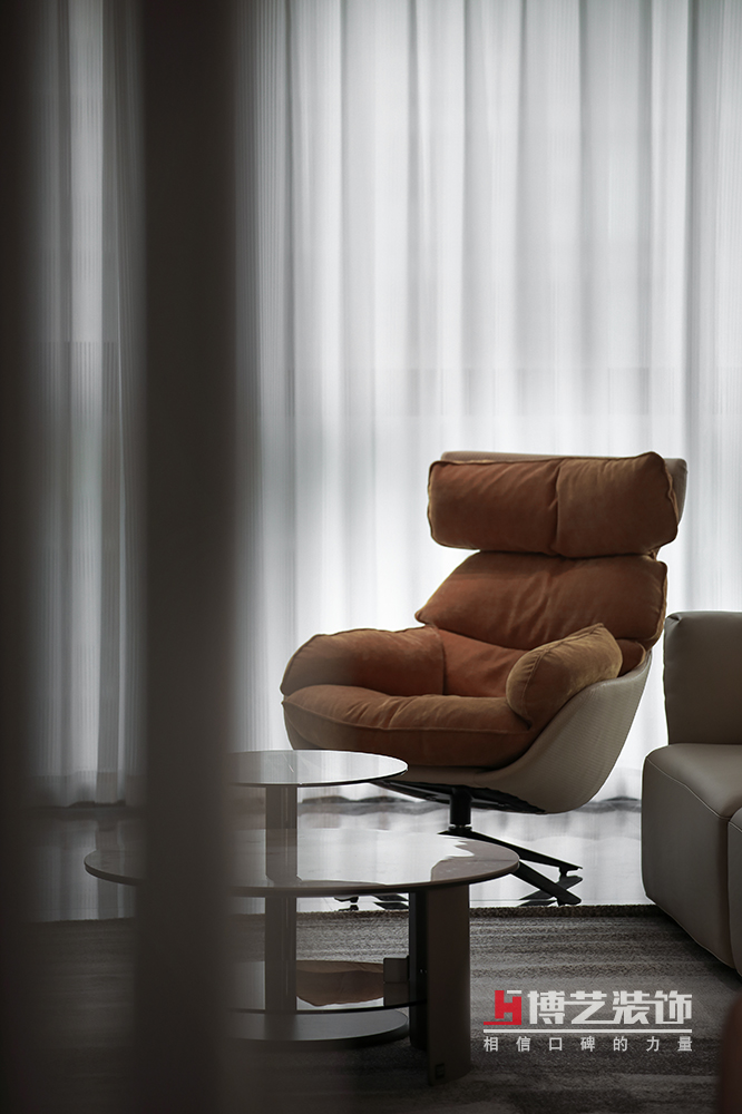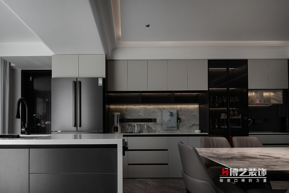 打通南北陽臺,采用開放式的設計,將整個公共區域融洽得組合在一起。用石材、巖板,格柵,玻璃,板材等基材,再輔以布藝,真皮,軟墊,在整個沉穩硬朗的基調中注入溫潤舒適,使之達到平衡。