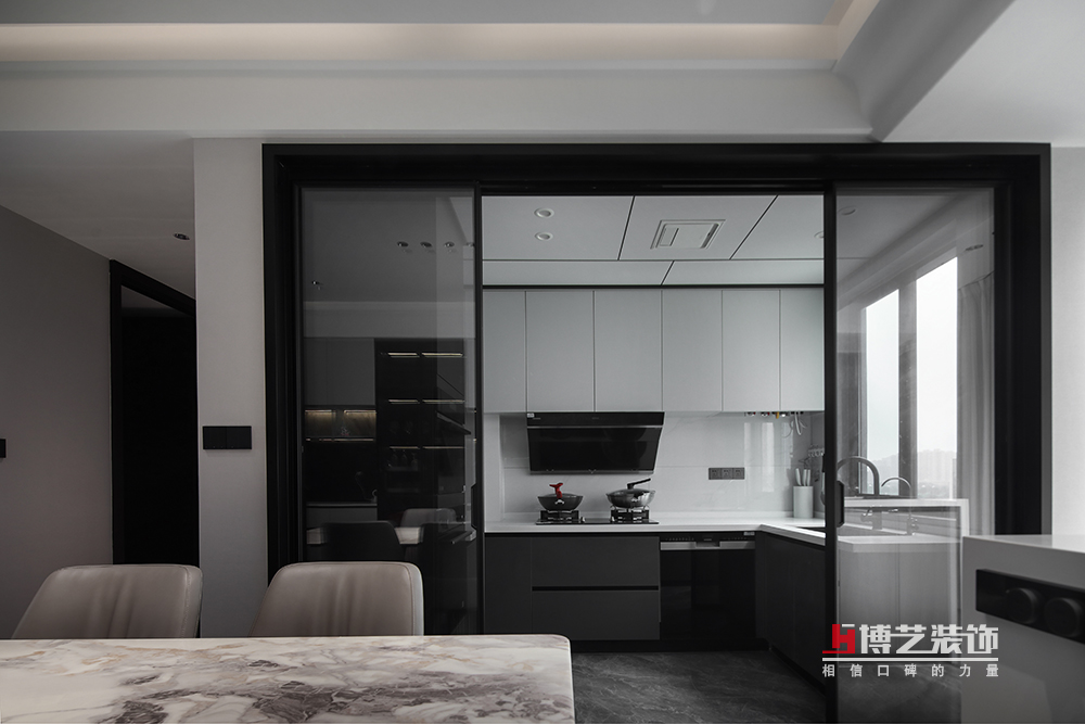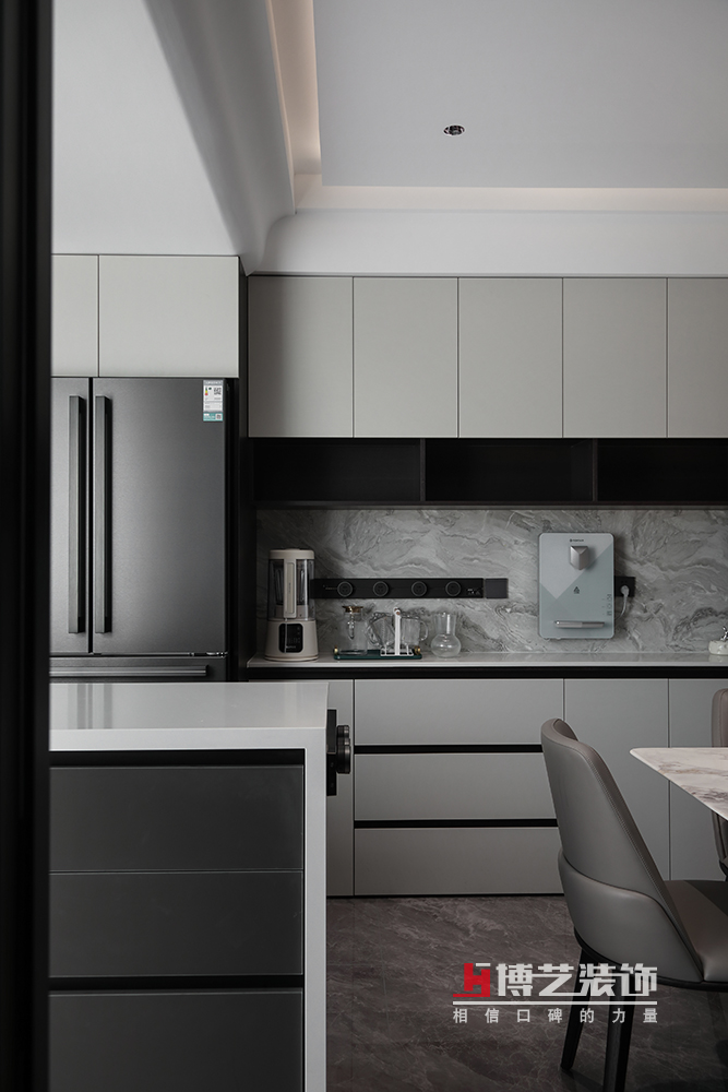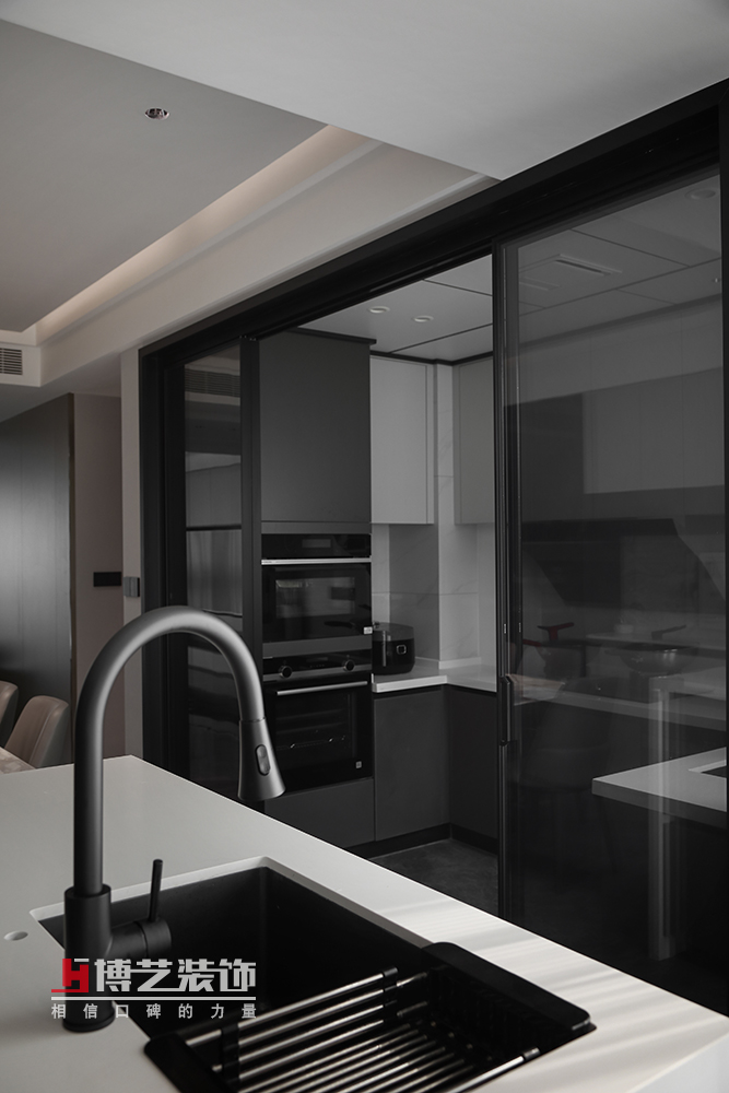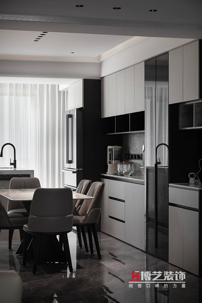 廚房曾被稱之為家里最孤獨的地方,但是隨著互動式家居設計的流行,這種孤獨感也逐漸在被打破。六口之家,家里開火的時間很多,用四聯動的玻璃移門進行隔斷。熱愛生活的人都熱愛烹飪,而熱愛烹飪的人總是懂生活的人。島臺冰箱外置,形成了很大的拿取洗切煮的大動線,再多人參與都不再話下。陽光和煦,微風浮動,菜香四溢,家人圍坐,我想這就是幸福的味道吧。