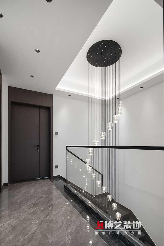 設計師以經典的黑白灰色調入手,調和著現代住宅對于低調質感生活的追求。通過合理運用玻璃,石材,格柵,不銹鋼,布藝,皮質等不同材質,融合進整個一樓公區。無主燈的設計搭配下沉式空間,讓整個客廳區域彰顯氣質。電視機的黑色大理石背景和沙發的白色大理石背景遙相呼應,在黑白之間,打造無限延伸的空間感。
