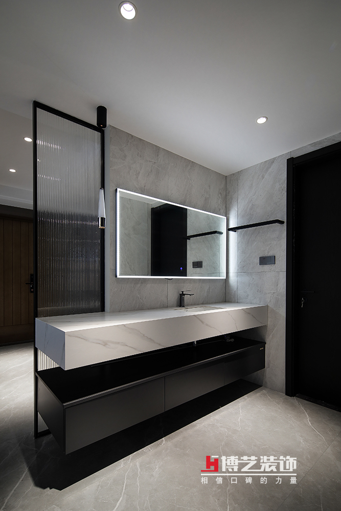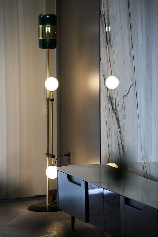 環繞式的木作讓空間更具溫度,高級感十足,木飾面與石材,木作與木作,地板與瓷磚…面與面之間的融合比對,產生視覺上的多方位享受,品質感讓生活更多舒適的體驗。
