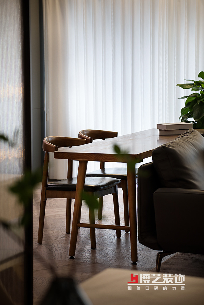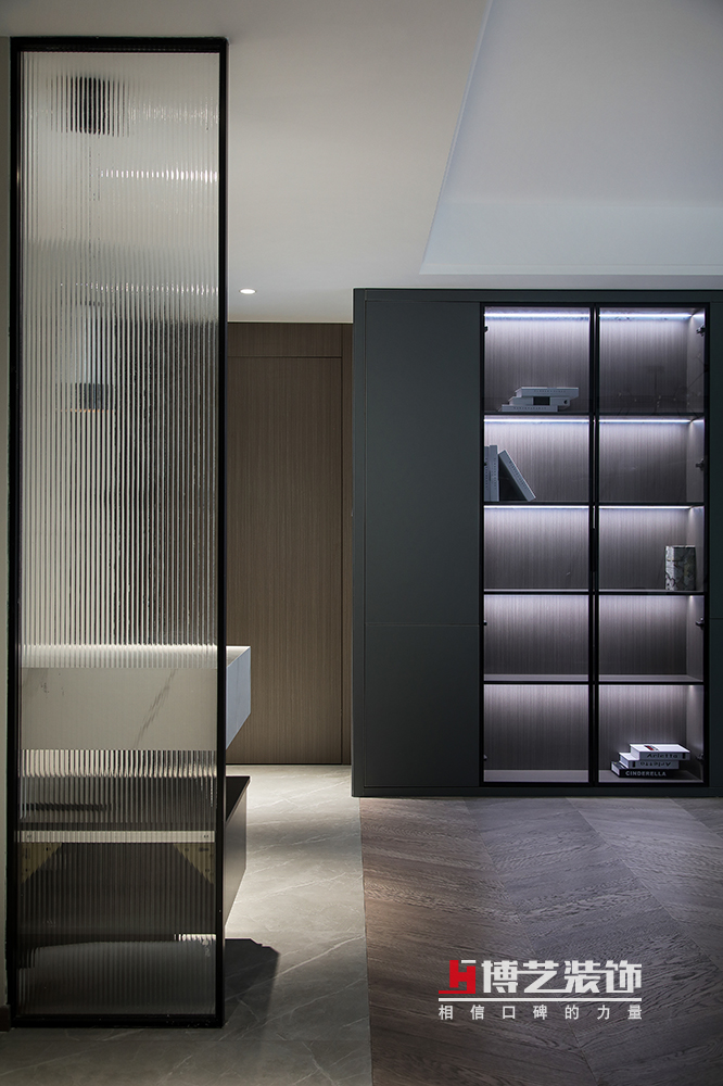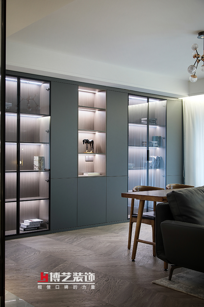 書房與客廳相連,通過地面的不同鋪貼做功能上的劃分,敞開式的設計空間上不設限,思緒可以發散性的擴散,工作學習不再壓抑,輕松的環境也是事半功倍的重要因素。