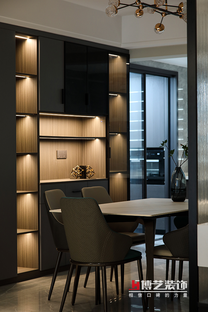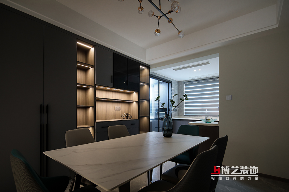 餐邊柜與書柜形成斜角對稱,適宜的尺度感調動了空間的靈活性,島臺作為廚房功能的延續,增添了更多的可操作性,家庭成員間的互動更加頻繁,彼此的親密度更高。