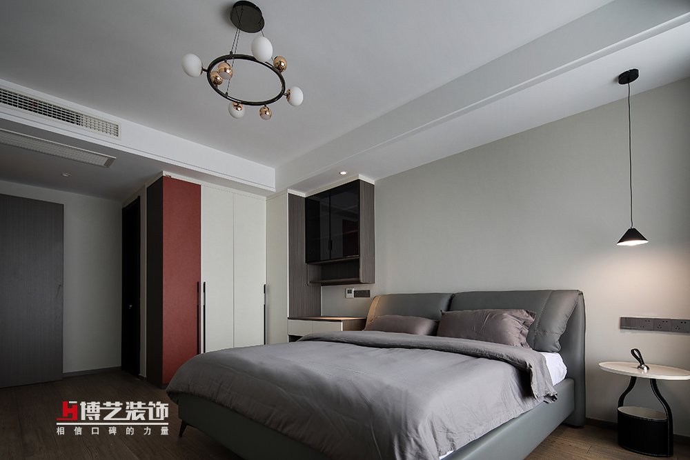 臥室以淺色為主,營造松弛平靜的氛圍感,轉角一抹紅色,不張揚卻揮灑著精致優雅。