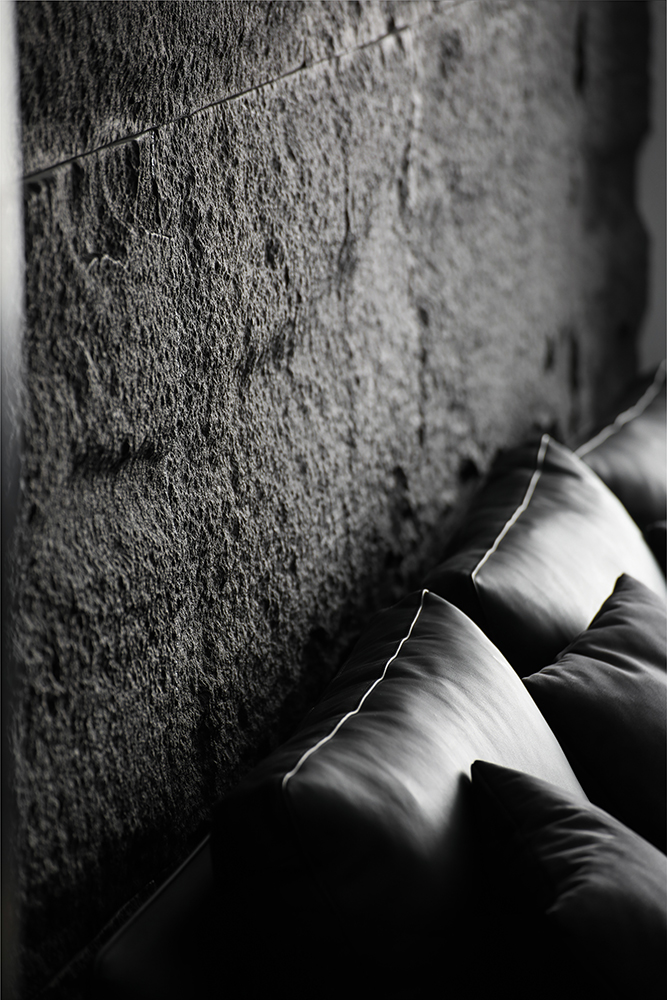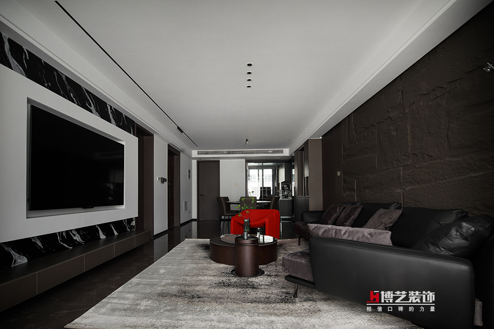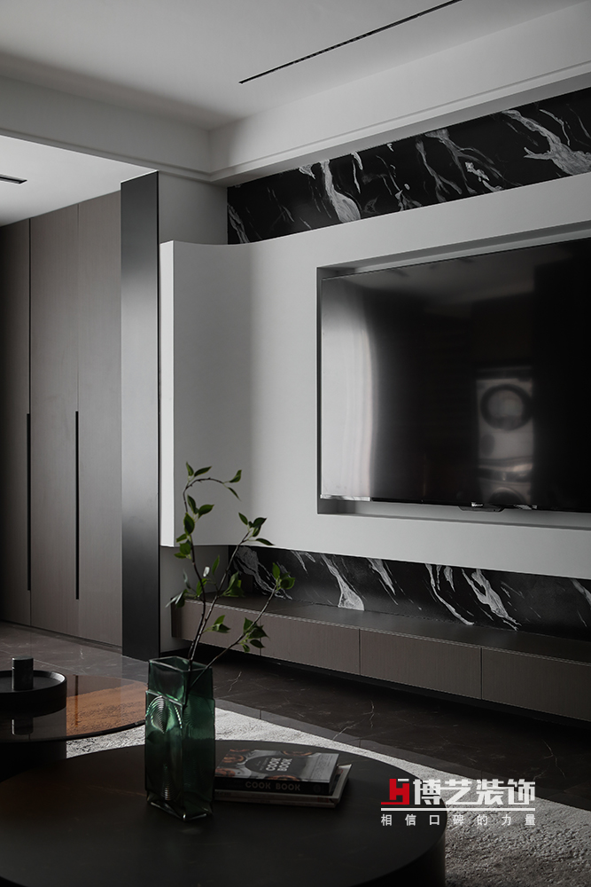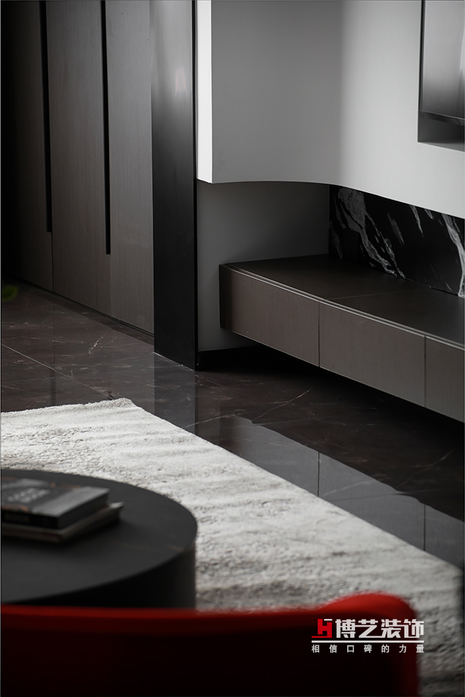 為了不讓暗黑系顯得過于壓抑,客廳選擇了白色的電視背景墻來進行中和。柔軟的布藝抱枕,舒適的絨質地毯,也讓客廳的溫度一下回溫。同色系的木飾面和石材的搭配,柔和中帶著原始的碰撞,藝術感拉滿。