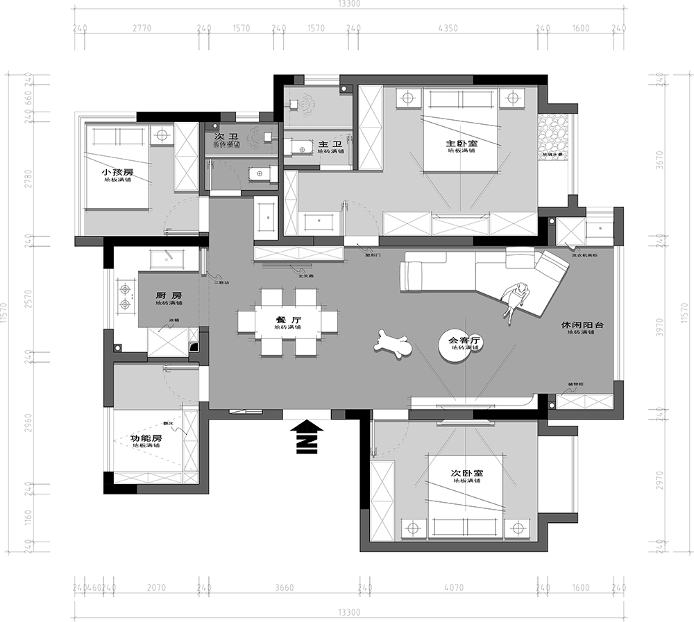1、打通南陽臺并做高柜,把洗衣機,烘干機都隱藏起來,形成大橫廳模式 。