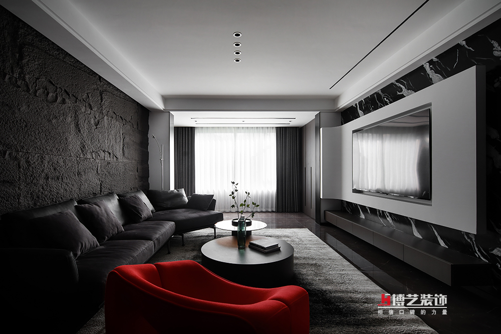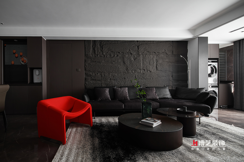 整個色調選用炫酷,個性的暗黑系為主色調,將整個黑色系大膽地從地面延生到墻面,深色調的安靜包容與輕奢高冷在這里展現的淋漓盡致。