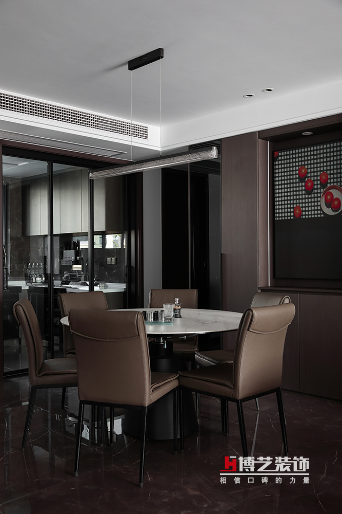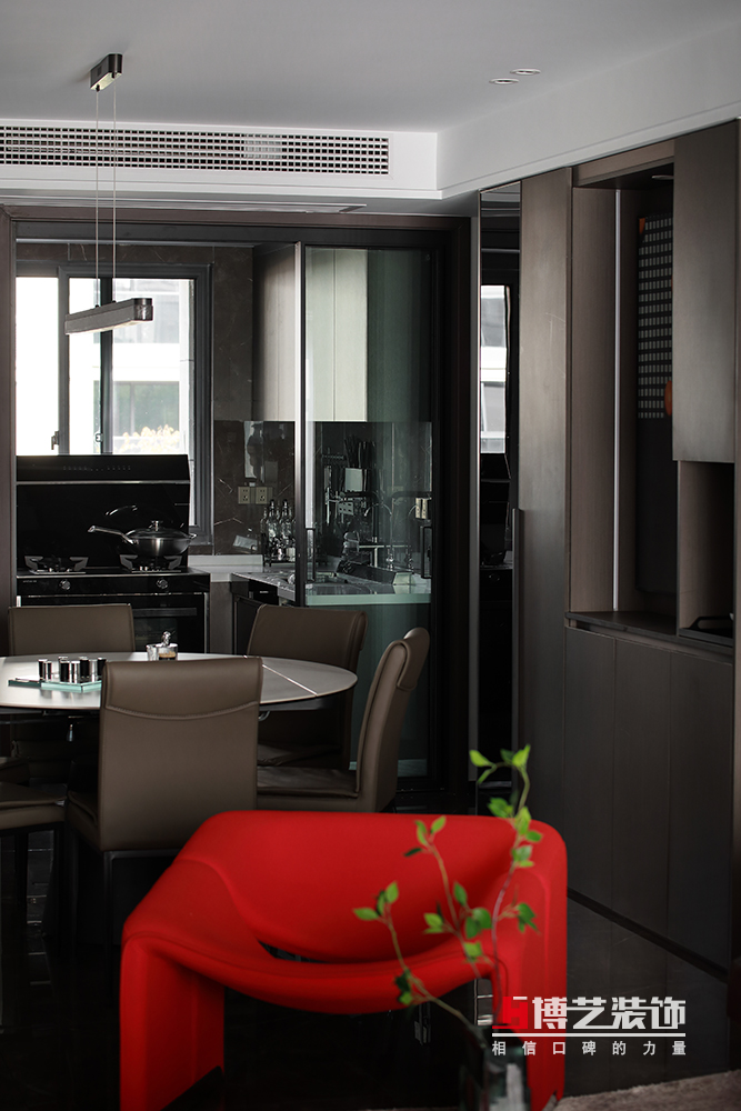 一組餐邊柜擔當了餐廳收納的重要角色。點睛的裝飾畫與客廳火紅的單椅互相照應,互相對話。