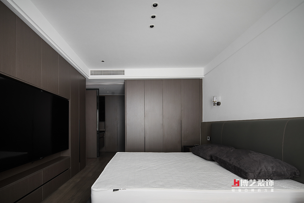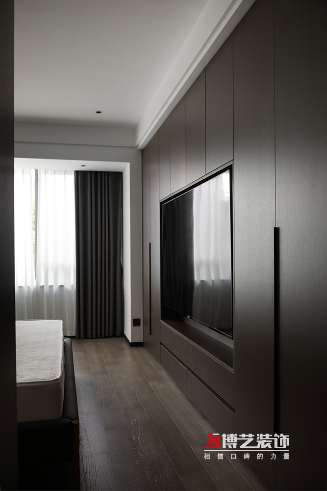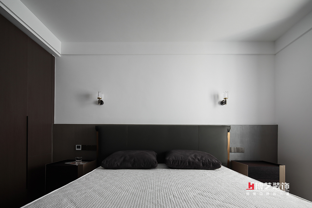 主臥延續了整體暗黑系的風格,打掉了飄窗,盡可能的拓展了空間,同時也讓光線更好得融入,并盡可能的做好收納。黑色的床背和窗簾搭配白色的墻面和天花,在黑與白的世界里營造一個安靜且不昏暗的清靜環境。