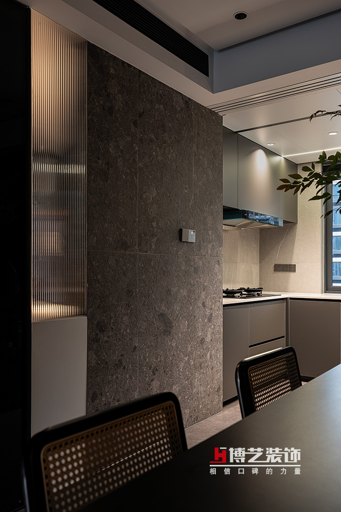 廚房灰色為視覺主色,銜接餐廳區(qū)域讓空間作延伸。黑、白、灰的組合也讓空間更為干凈、整潔。