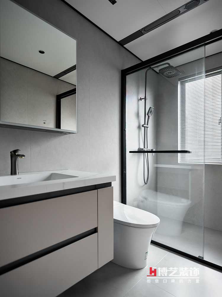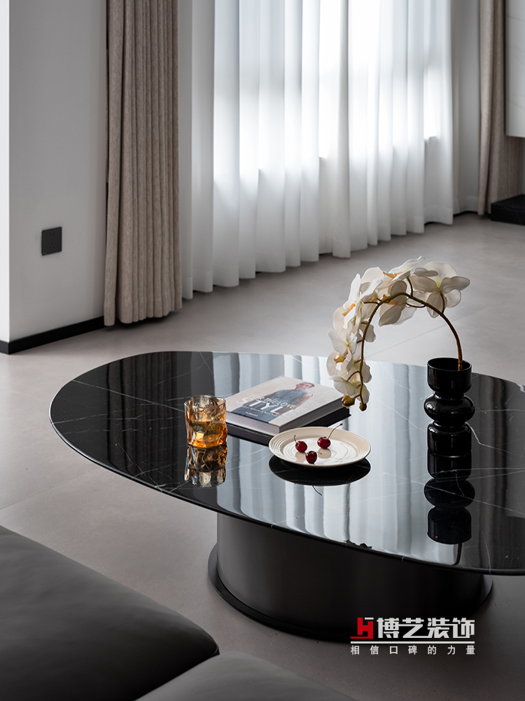 柔光灰色地磚作為地面的基礎色,從白墻到深色家具有了更好的銜接和過渡,也讓整個家看上去更加柔和。讓一黑一白,硬朗柔軟在這個空間形成反差,也和諧共處。