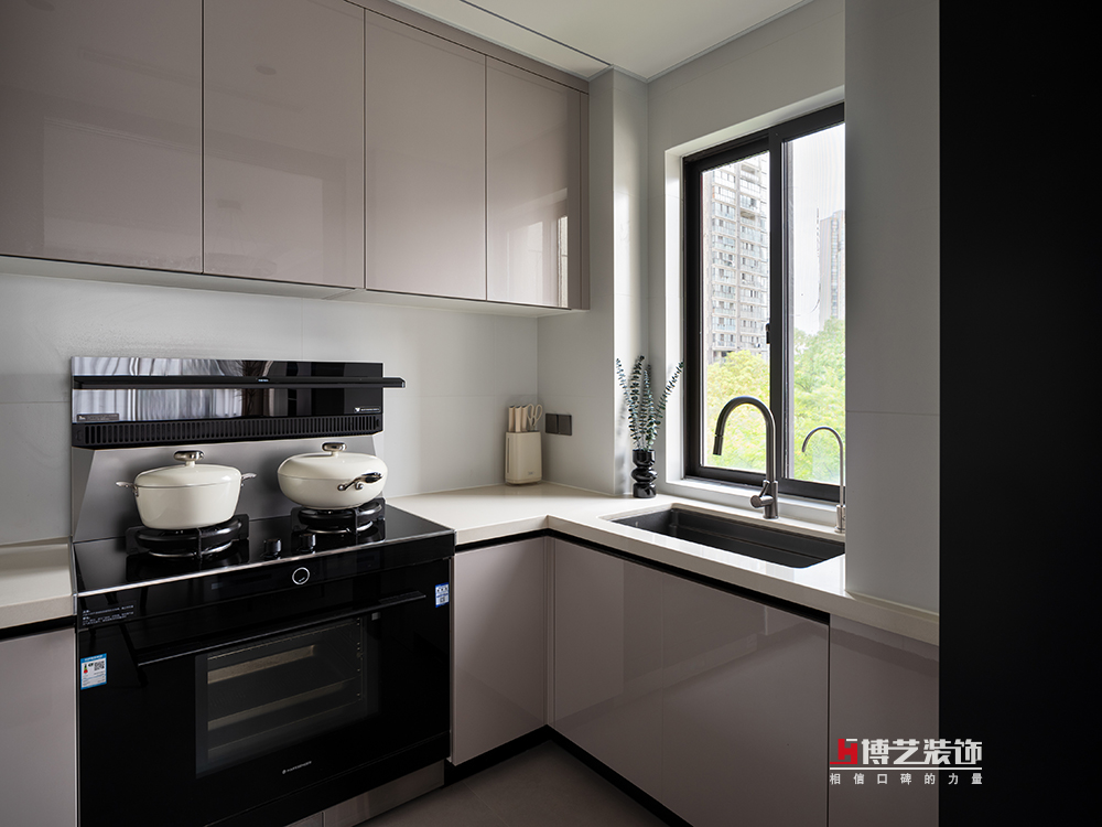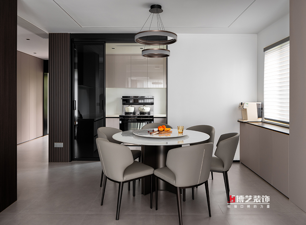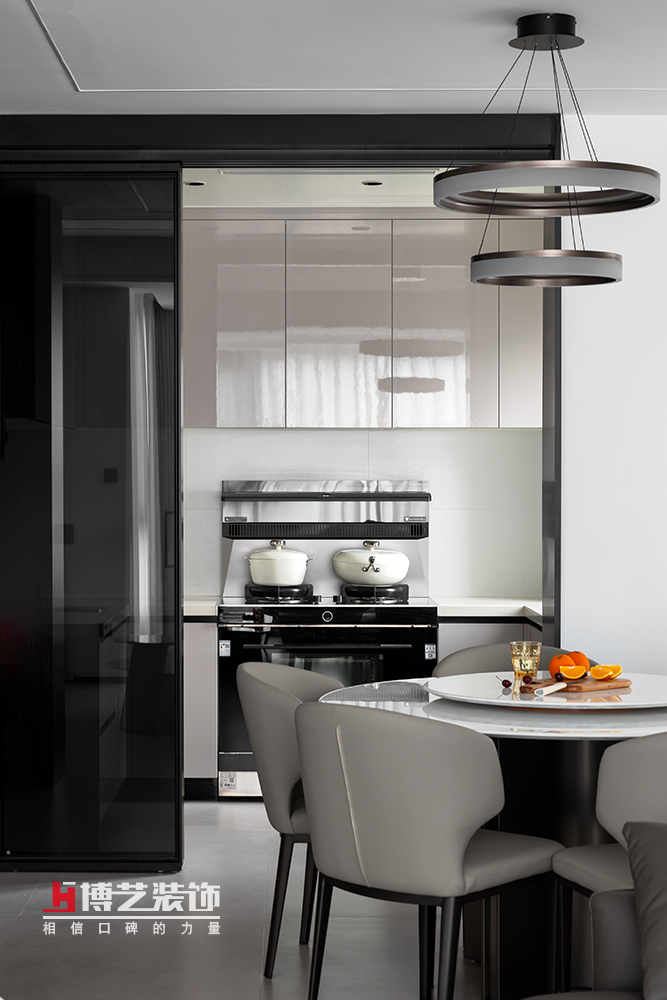 改變開門方向之后的廚房與餐廳聯動,以移門分隔。朝東的窗戶采光極好,搭配現代極簡的設計營造出明亮而愜意的用餐環境。