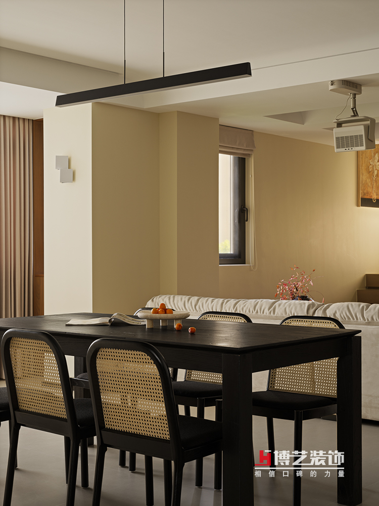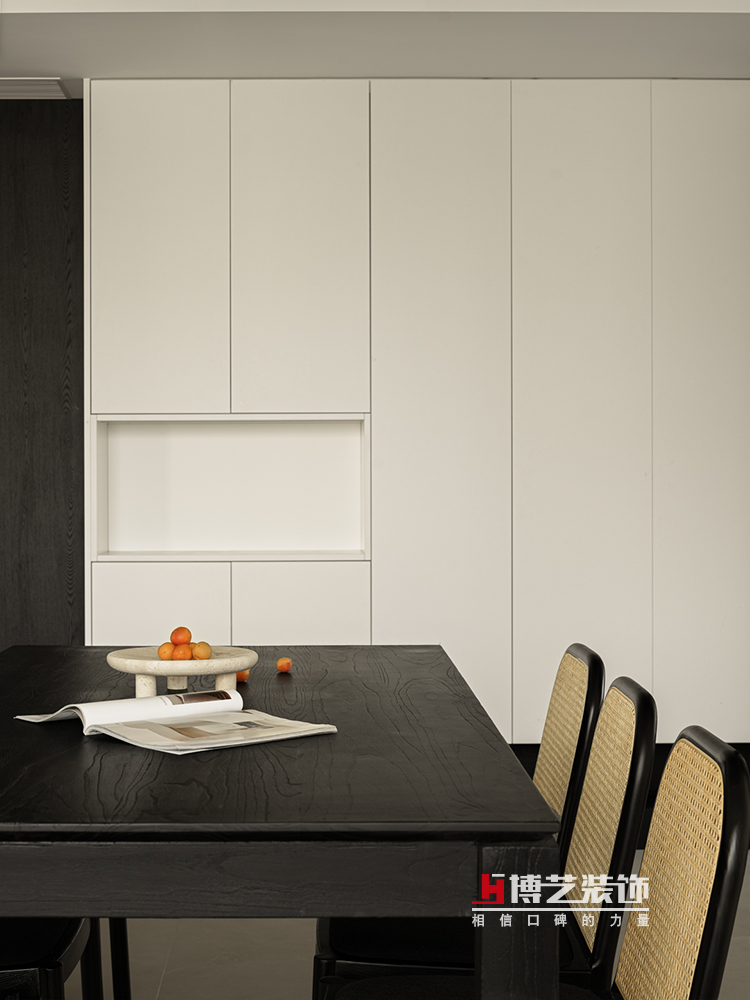 餐廳區(qū)域以黑色和白色為主調(diào),營(yíng)造出質(zhì)樸而簡(jiǎn)約的用餐環(huán)境。餐廳的吊頂設(shè)計(jì)簡(jiǎn)潔而不失現(xiàn)代感,為用餐時(shí)光增添了一抹溫馨的光影。