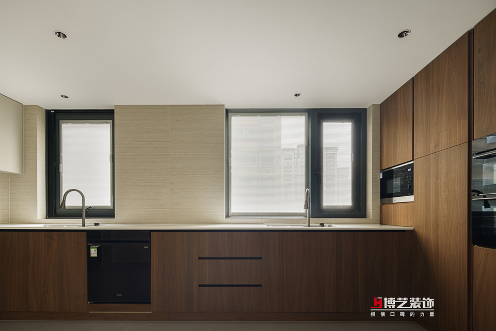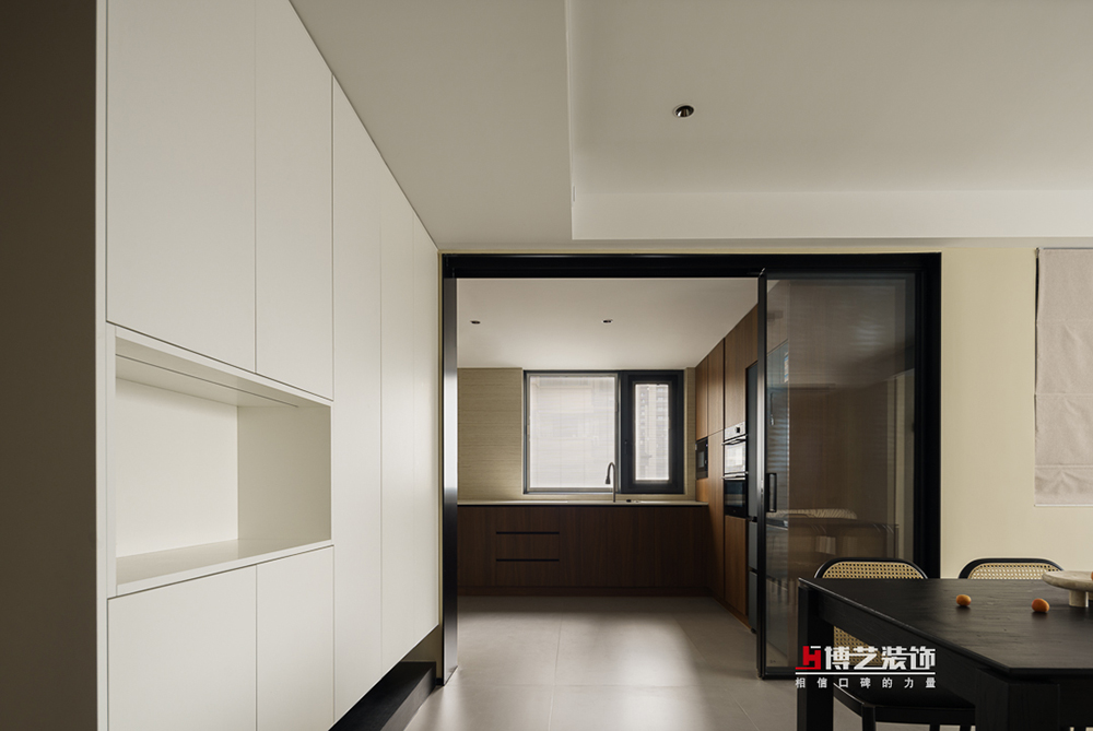 廚房?jī)?nèi)的木質(zhì)櫥柜,其自然紋理和色彩與白色墻面形成和諧的對(duì)比。
