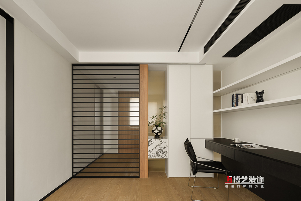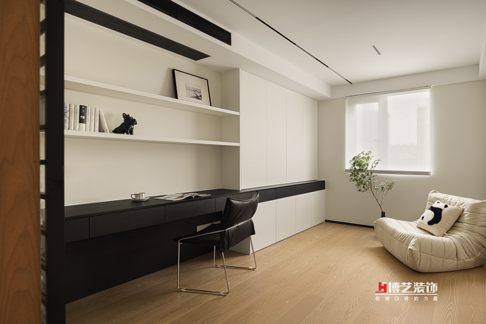 書(shū)房區(qū)域通過(guò)巧妙的空間布局既保持了獨(dú)立性又不失整體的和諧統(tǒng)一。書(shū)房的設(shè)計(jì)注重功能性與舒適性的結(jié)合,書(shū)架采用開(kāi)放式設(shè)計(jì),方便書(shū)籍取閱。