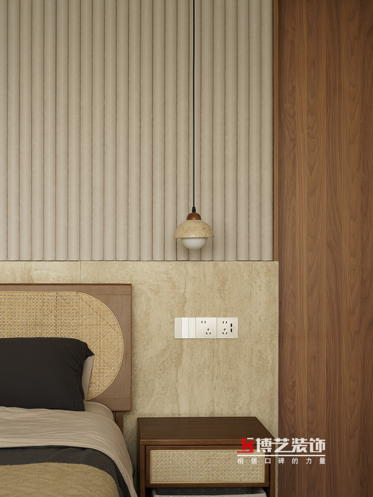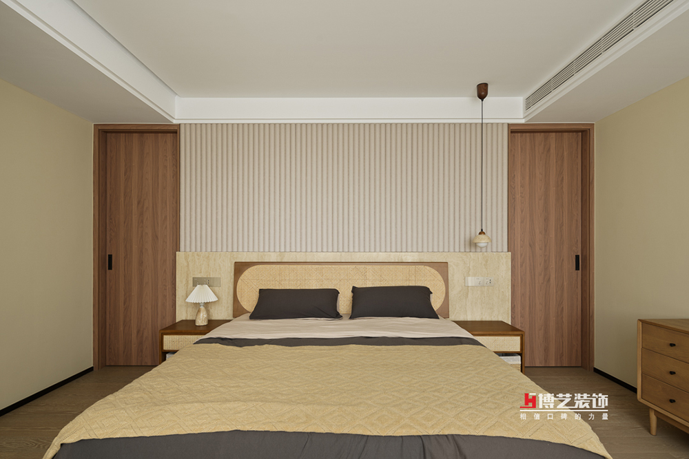 在主臥的設(shè)計(jì)中,我們保持了詫寂風(fēng)的格調(diào)去追求一種超越物質(zhì)的內(nèi)在平靜。在色彩上,以大地色為主色系,米色、黃色等不僅溫和且能夠讓人心情平和,營(yíng)造出一種原始而質(zhì)樸的氛圍感,一個(gè)靜謐而帶有禪意的空間。