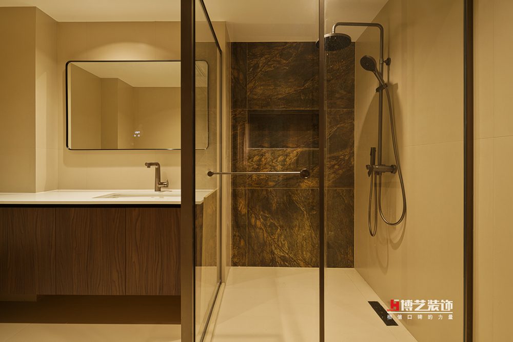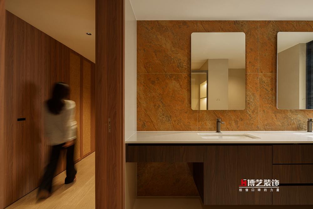 衛(wèi)生間以簡(jiǎn)潔的線條和自然的材料營(yíng)造出一種淡泊而深邃的氛圍。墻面和地面的石材以其原始的紋理和色彩展現(xiàn)出質(zhì)樸的美感,造型利落的衛(wèi)浴設(shè)備展現(xiàn)出簡(jiǎn)約之美,在滿足功能性的同時(shí)也成為空間中的藝術(shù)品。