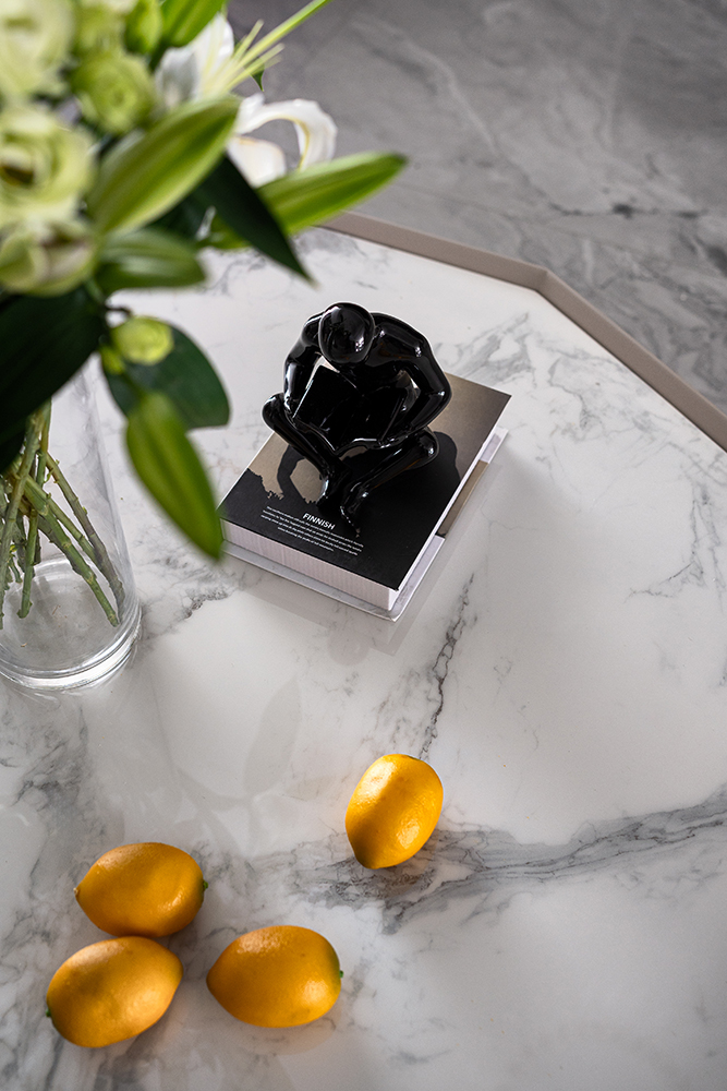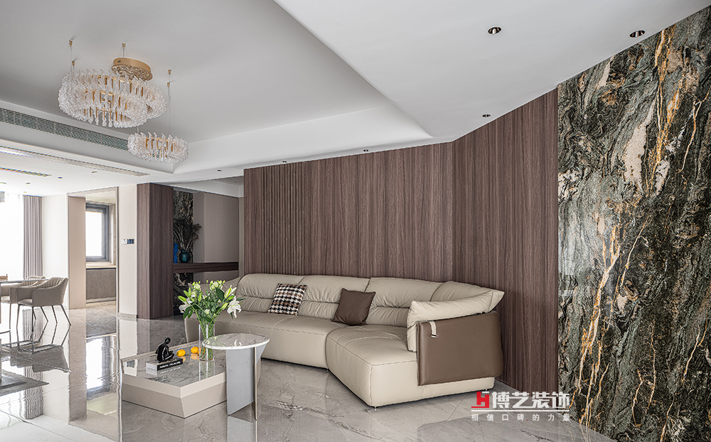 客廳自帶廣角視野,當陽臺的光直接進入,整個場域變得寬敞又通透。線條與木作契合,搭配著石材一起勾勒出優雅的輪廓,營造寧靜而舒適的生活氛圍。
