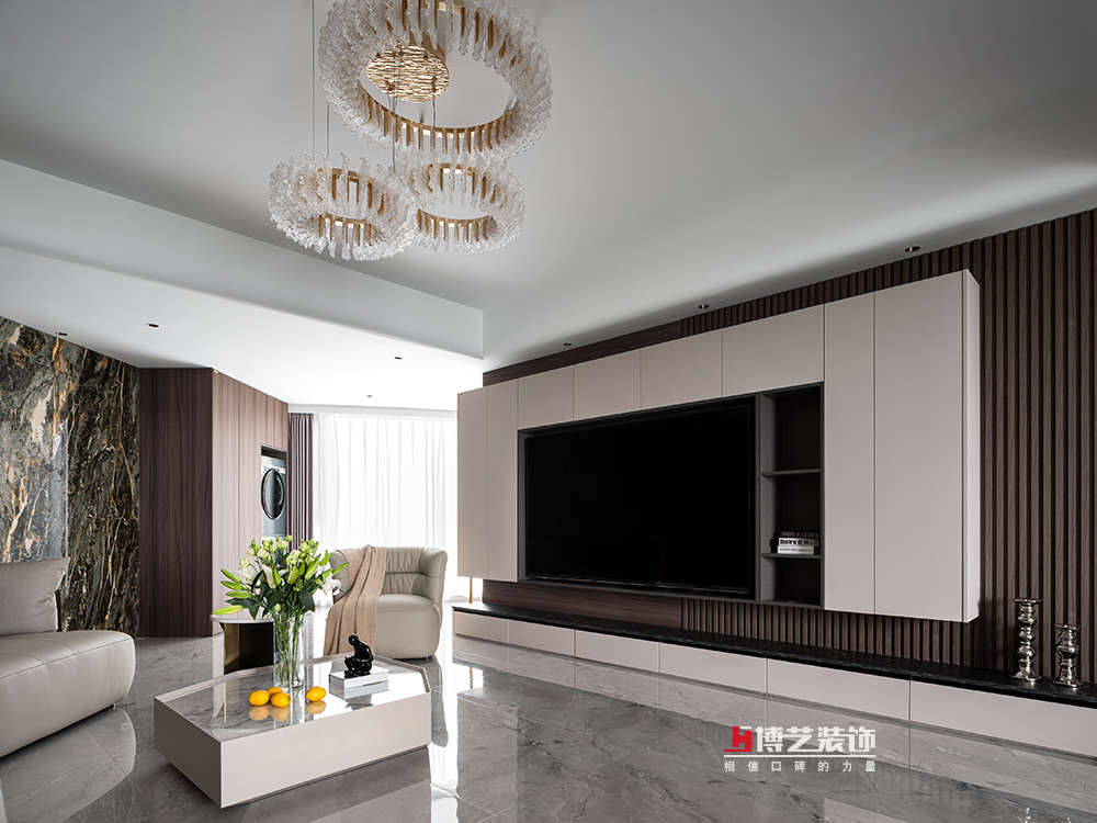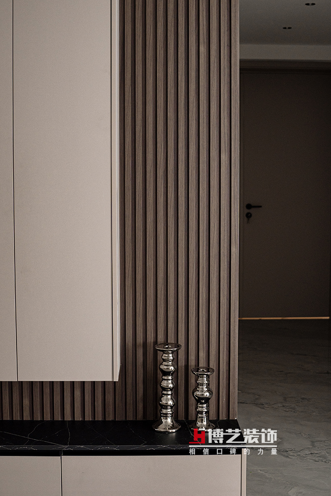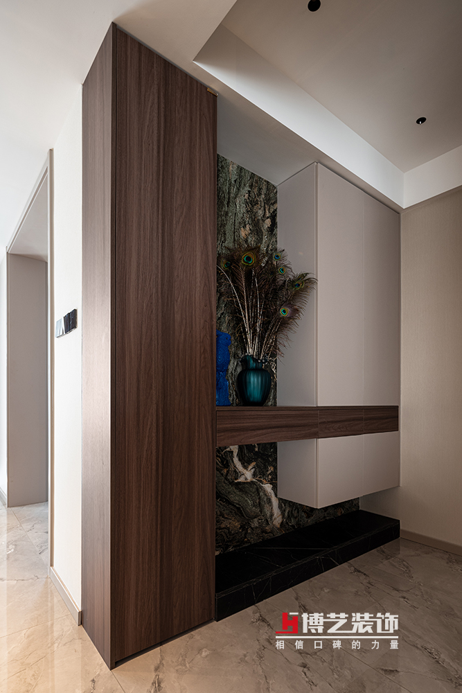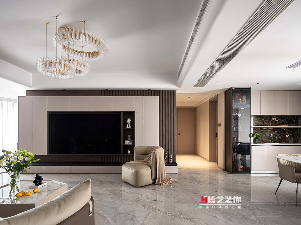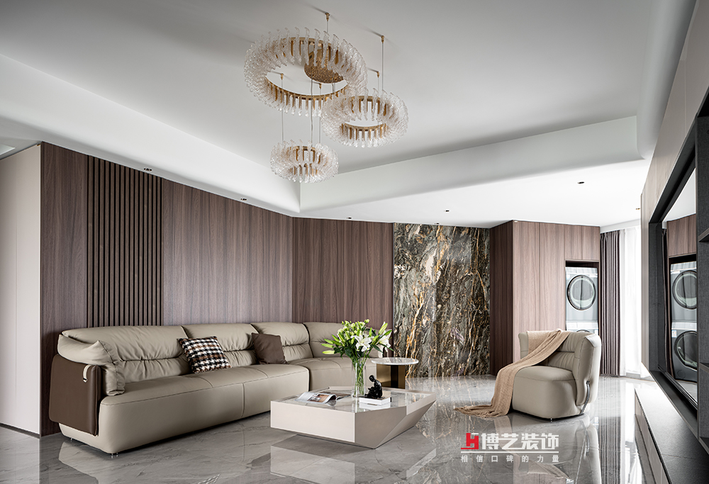暖棕色與白色的組合賦予空間明亮沉穩的質感,一抹綠色悄然入眼給空間帶來生機與自然元素,整個空間優雅卻又不失時尚的活力。