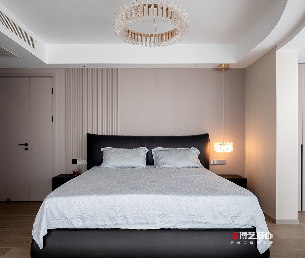 淺奶咖的墻面,溫柔、恬靜,黑色的大床深邃、沉穩,強烈的對比,和諧的共處,共同營造一片舒適、安寧的睡眠環境。