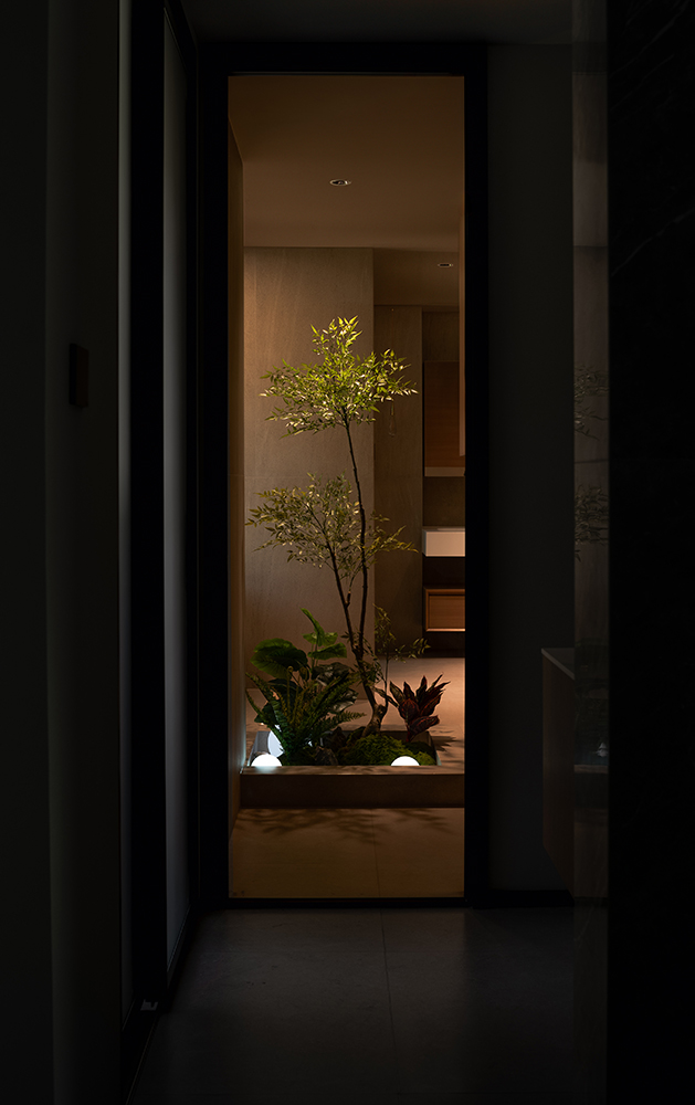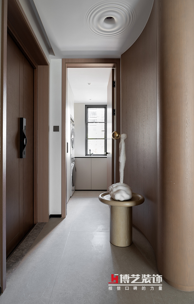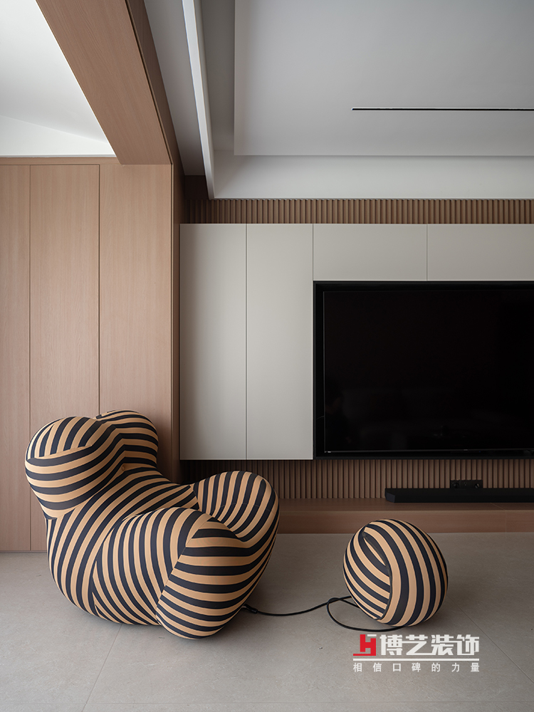 挑選一個(gè)有趣的擺件讓歸家的儀式感從進(jìn)門就開始升華,也給客人留下溫暖的第一印象。通過自然光線到燈帶光的過渡,以光為引,繞過弧形飾面,緩緩進(jìn)入客廳,在視覺上形成了緩沖,又讓整個(gè)空間有了延伸感。