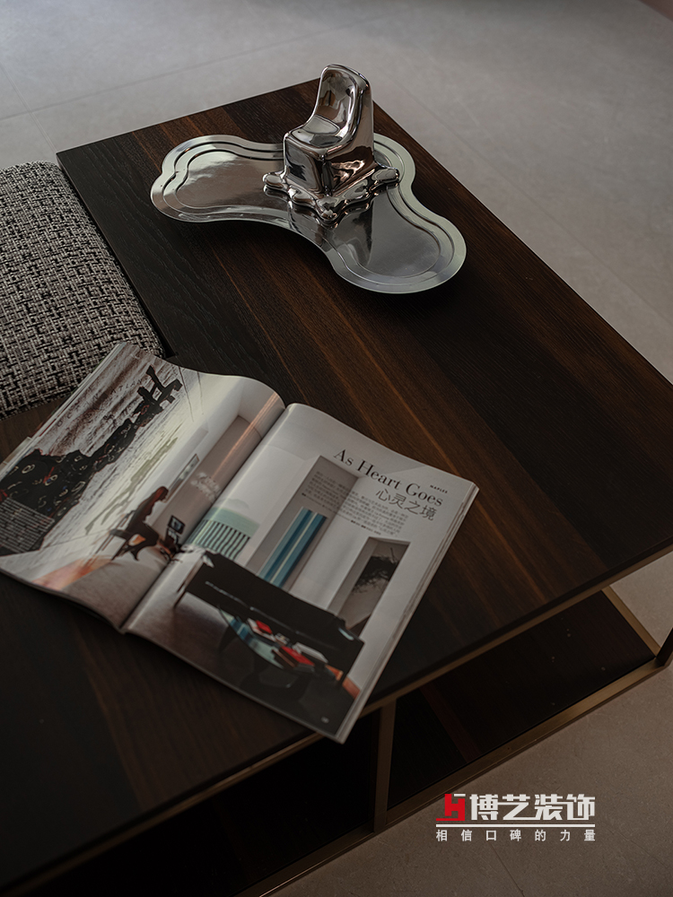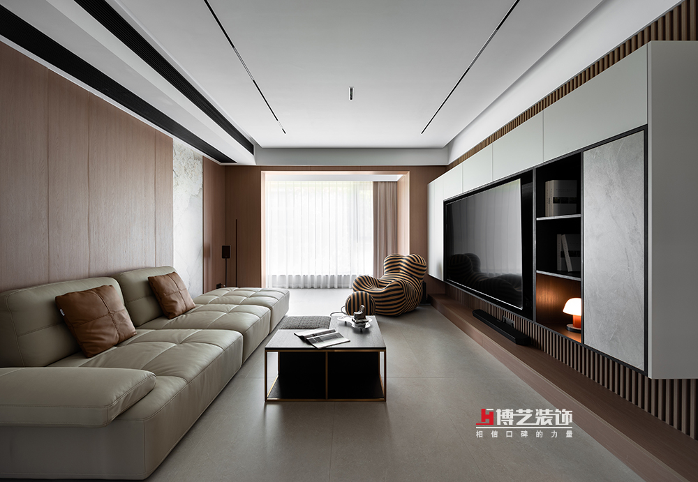 客廳采用現(xiàn)代意式的設(shè)計(jì)理念,以原木色,灰色,白色為主色調(diào),使用線條和簡單的紋理,豐富了客廳層次的同時(shí),讓整個(gè)空間更簡潔、實(shí)用,也表明了主人追求效率和功能性的生活態(tài)度,也給人一種輕松、無壓力的放松感。