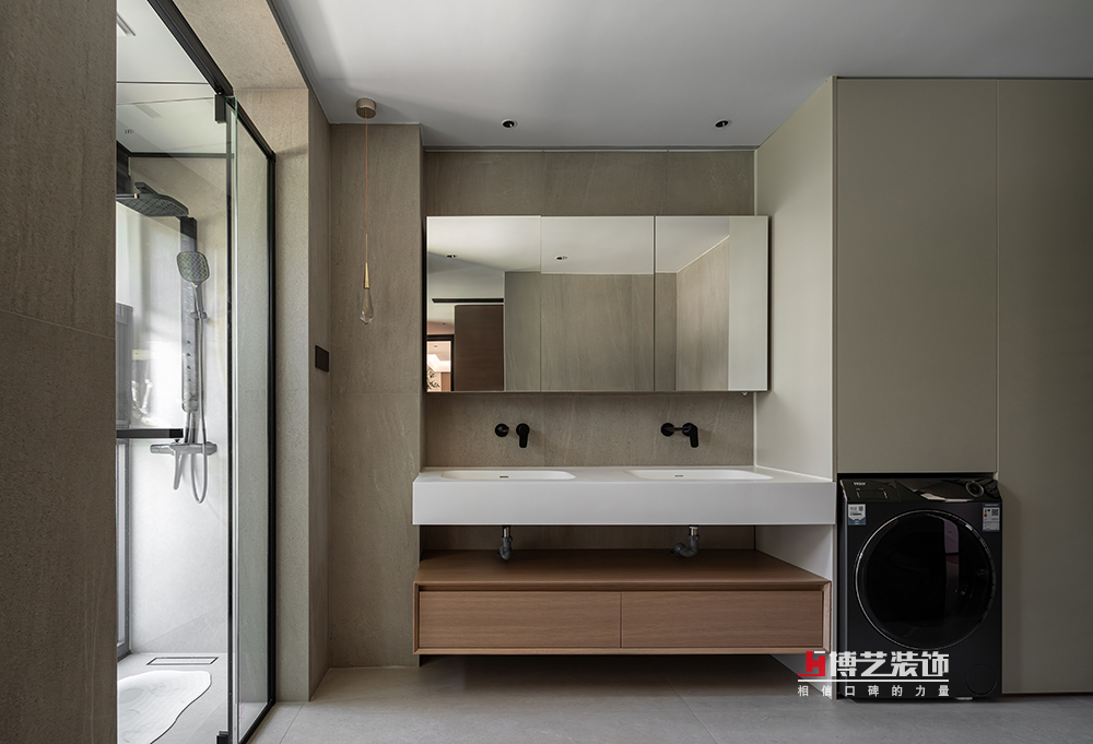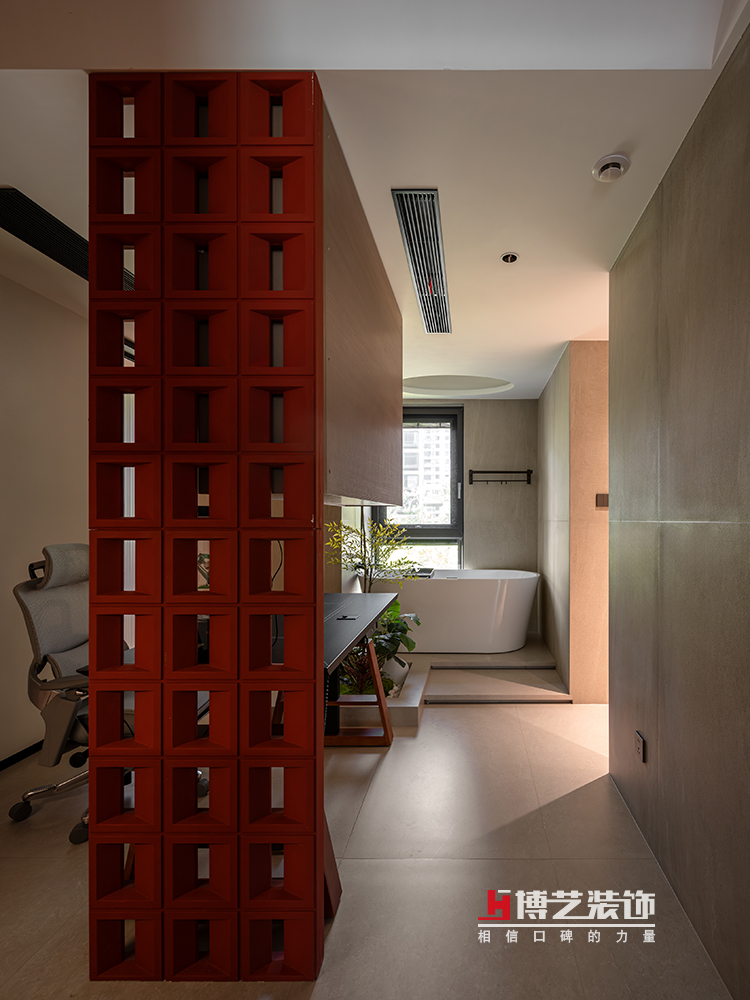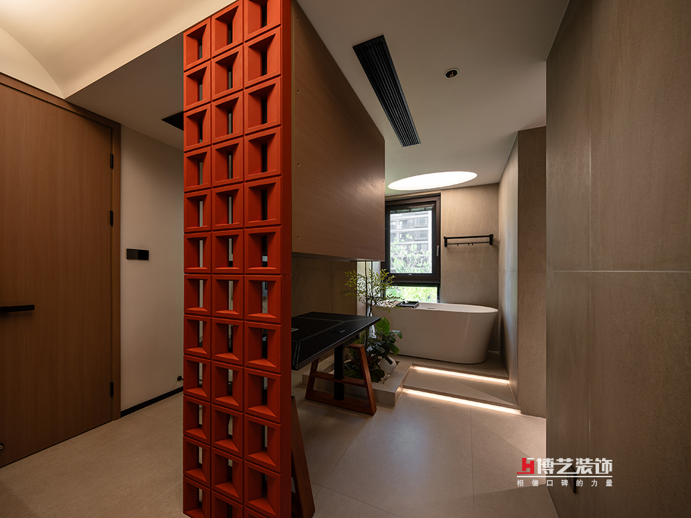 利用亮眼的紅色點(diǎn)綴空間,與整體色調(diào)達(dá)到和諧狀態(tài),同時(shí)巧妙劃分主臥各個(gè)功能區(qū)域,既保證了區(qū)域之間相對(duì)的獨(dú)立性,又讓各個(gè)空間在套房里呈現(xiàn)一種開放感。在結(jié)束一天的工作之余,在水汽繚繞中,卸下滿身疲憊,徹底放松身心。