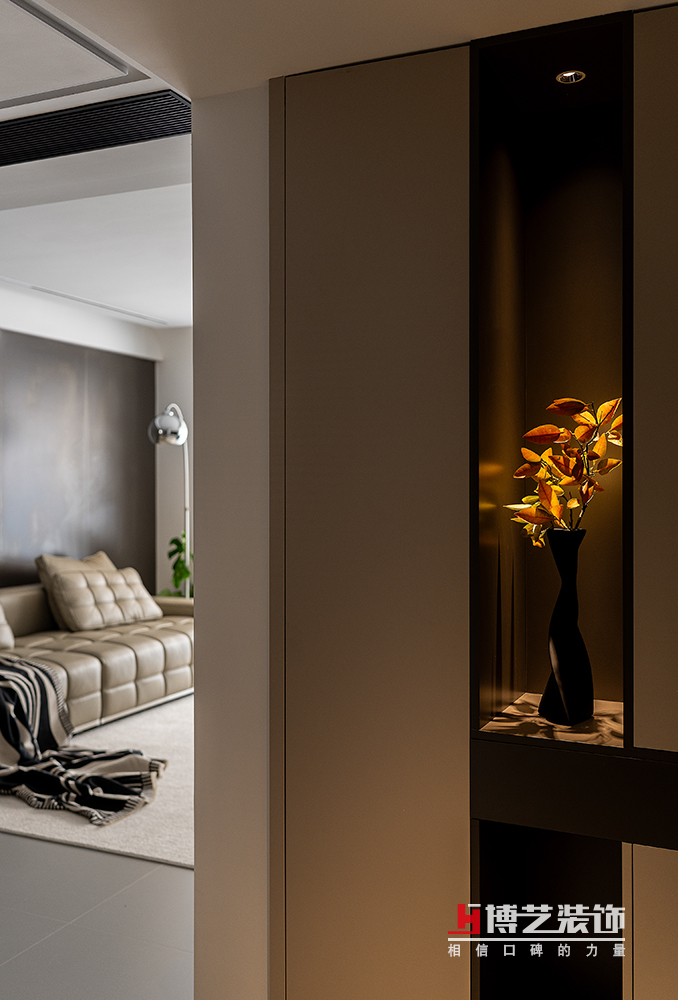 當(dāng)踏入這處居所,映入眼簾的便是玄關(guān)處那高至頂?shù)男P(guān)柜,黑色深灰相輔相成,不僅充當(dāng)著日常的門(mén)面擔(dān)當(dāng),也收納著日常的鞋履雜物,更在進(jìn)門(mén)的瞬間便奠定了空間的沉穩(wěn)基調(diào)。柜體上方留置了小燈,打在精心挑選的擺件上,為歸家之人帶來(lái)一抹溫馨的光亮。