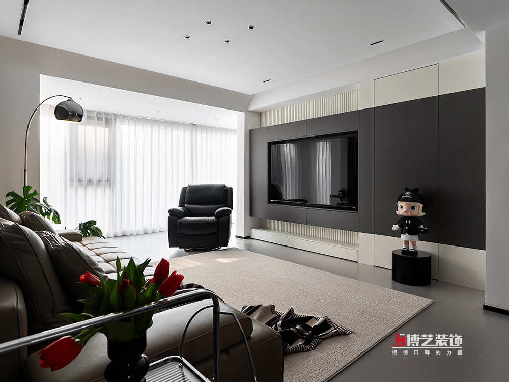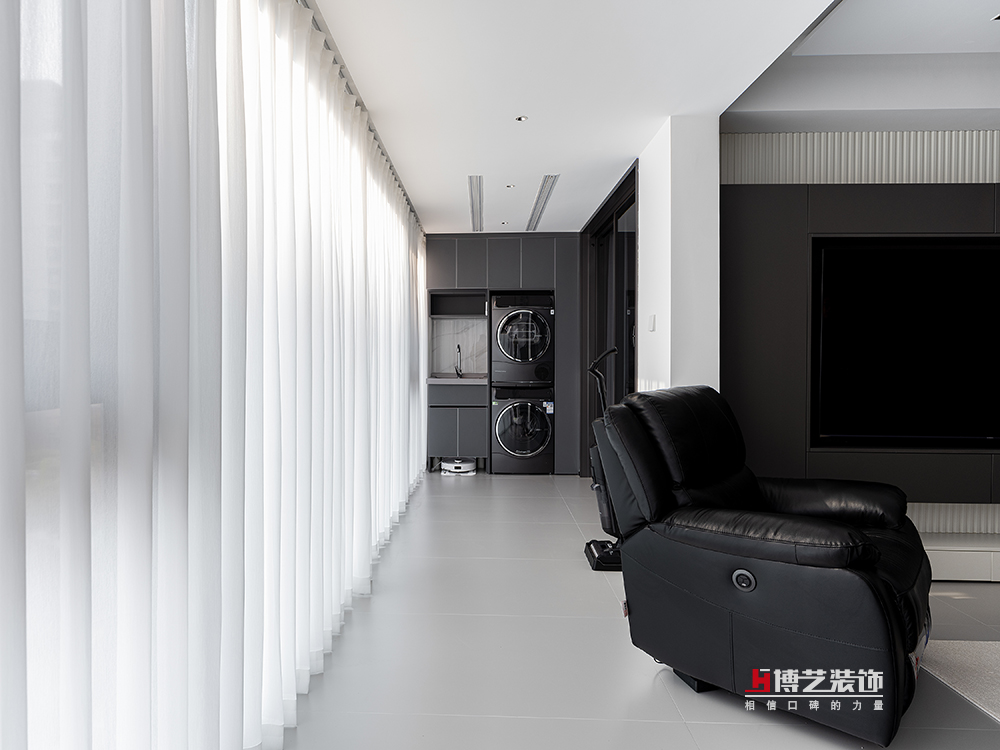 客廳與陽(yáng)臺(tái)之間的隔斷被徹底打通,取而代之的是一整面通透的落地玻璃窗,將室外的自然光毫無(wú)保留地引入室內(nèi)。陽(yáng)光透過(guò)輕柔的白色紗簾,灑在客廳的每一個(gè)角落,與室內(nèi)的黑白灰基調(diào)相互交融,營(yíng)造出一種靜謐而溫暖的氛圍。