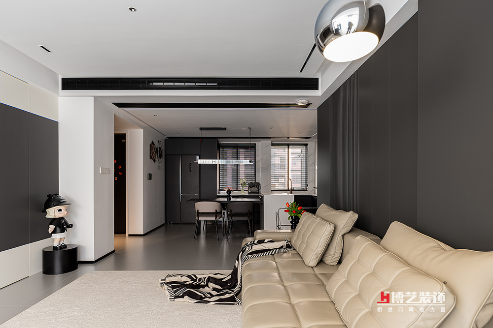 客廳以黑白灰為主色調(diào),地面鋪設(shè)著細(xì)膩的灰色巖板磚,向四周無(wú)限延展。墻面則被粉刷成純凈的白色,與地面形成鮮明對(duì)比,讓空間在視覺(jué)上更顯開(kāi)闊通透。而沙發(fā)背景墻和電視背景墻都是黑色的格柵搭配木飾面,互相呼應(yīng)。