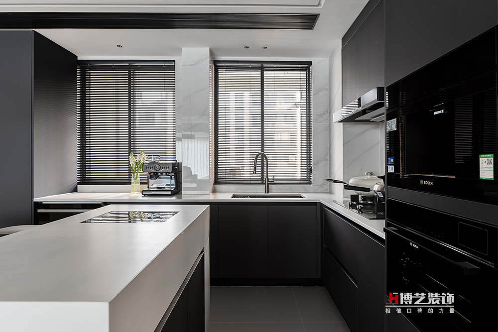 島臺(tái)是整個(gè)餐廚空間的靈魂所在,它不僅是烹飪操作的延伸,更是家人交流互動(dòng)的中心。島臺(tái)采用大面積的白色大理石臺(tái)面,與中西廚的黑色臺(tái)面形成鮮明對(duì)比,成為視覺(jué)的焦點(diǎn)。無(wú)論是忙碌的清晨,還是悠閑的午后,家人都可以在這里小憩片刻,享受一杯咖啡或一份精致的甜點(diǎn)。