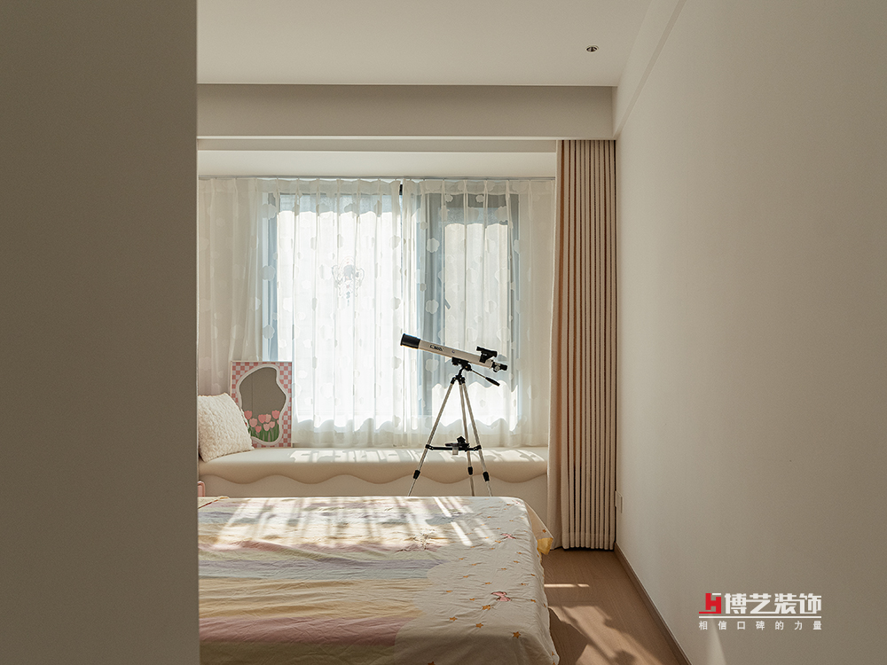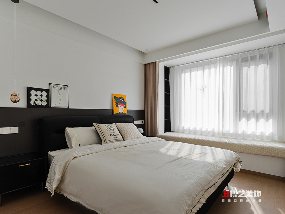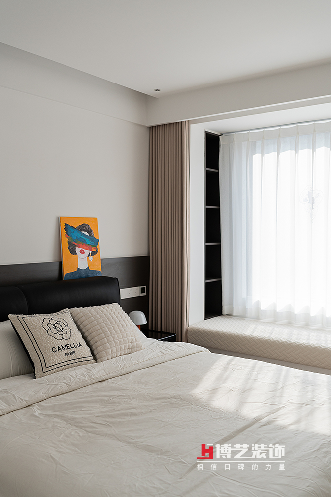 臥室的飄窗區(qū)域被巧妙地利用起來(lái),窗臺(tái)上鋪設(shè)著柔軟的軟包,搭配壁龕式的書(shū)架,便成了一個(gè)舒適的休閑角落。在這里,可以慵懶地倚靠在窗邊,透過(guò)飄窗欣賞著室外的美景,感受著陽(yáng)光灑在身上的溫暖,讓身心在這一刻徹底放松。