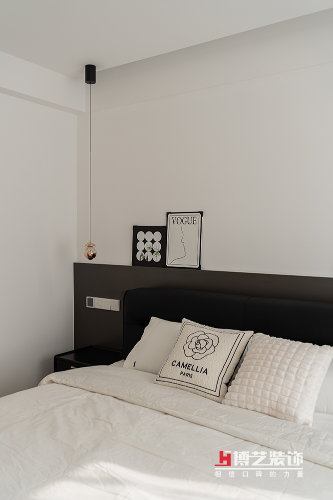 床頭背景墻采用黑色木作材質(zhì),搭配上深邃的黑色真皮大床,更添一份沉穩(wěn)與質(zhì)感。床頭一側(cè)則擺放著一盞蘑菇臺(tái)燈,其造型簡(jiǎn)約而別致,圓潤(rùn)的燈罩宛如一朵綻放的蘑菇,散發(fā)出柔和而溫暖的光線,為夜晚的閱讀或小憩時(shí)光增添了一份浪漫與愜意。