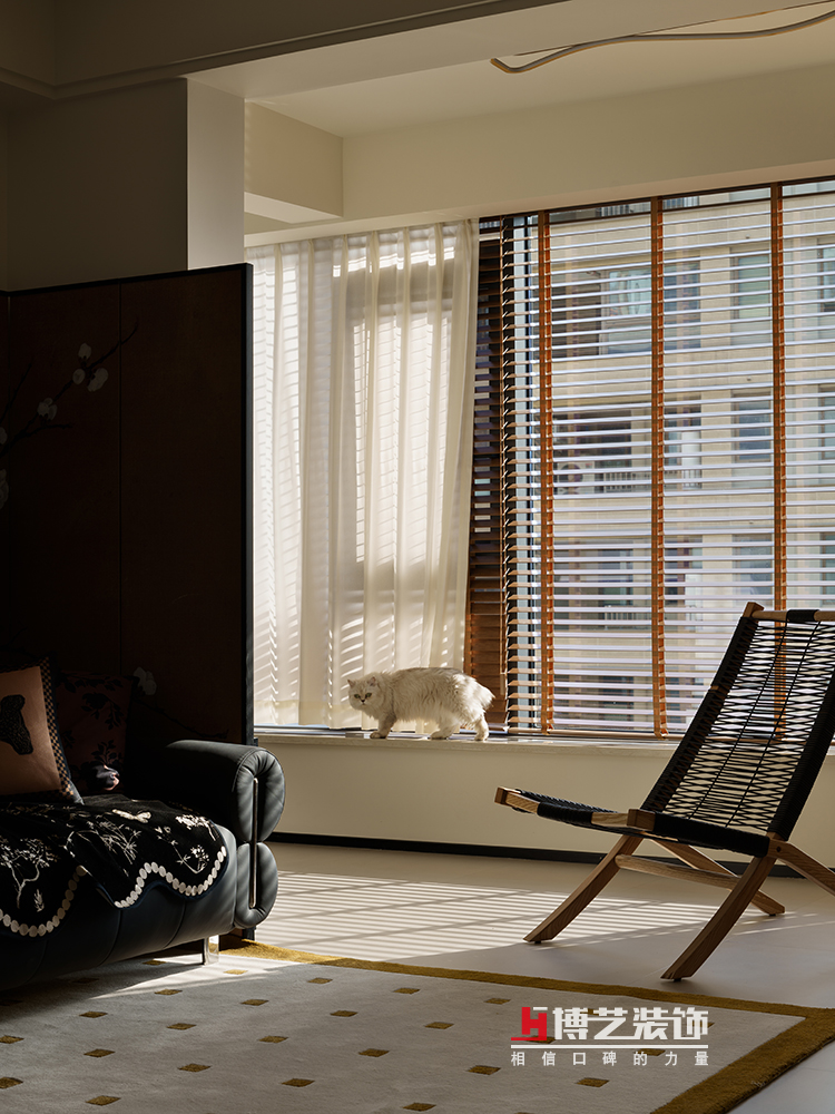 去茶幾話設(shè)計(jì),把南陽(yáng)臺(tái)打通,空間一下子就豁然開朗。同時(shí)給貓主子配備了專門的收納柜,裝飾的同時(shí)也滿足儲(chǔ)物的需求,讓收納也成為了空間美學(xué)的一部分。