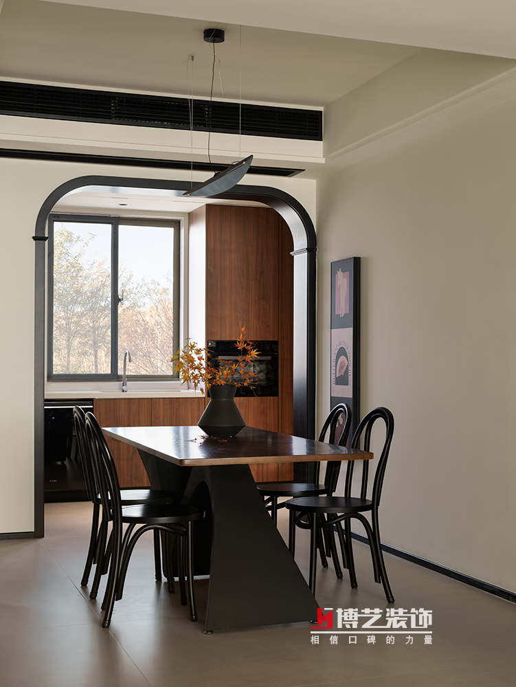 整個(gè)餐廳空間以暖白色為基調(diào),溫暖的胡桃木勾勒出溫馨的就餐氛圍,摩登和復(fù)古在此碰撞出時(shí)髦的火花。幾枝紅楓仿佛在不經(jīng)意間就完成了自然與人文的對(duì)話。