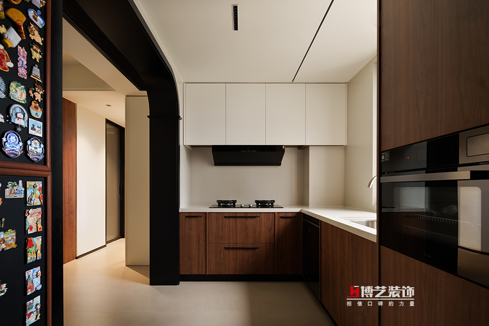 選用胡桃木溫暖的材質(zhì),與白色的臺(tái)面呼應(yīng),復(fù)古中不乏帶點(diǎn)清爽,呈現(xiàn)不一樣的生活氣息。空白的一面墻留給家里的收藏——冰箱貼,時(shí)間在這里變得柔軟,過去的歡樂時(shí)光仿佛電影般在這里呈現(xiàn)。