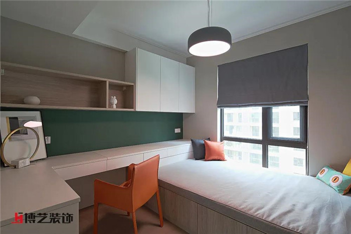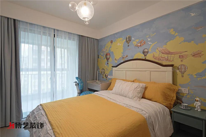 我們深知生活環境對于培養孩子的秩序性,自律性的重要性,所以我們著重在兒童房打造了睡眠區,學習區和儲物區。而對于男孩子來說,太空遨游是每個男孩子的夢想,而大多數的創造力都來自孩子的好奇心和冒險精神,所以設計師選用了遨游太空的壁畫,讓冒險精神在孩子心理扎根,讓孩子從小就萌發大膽嘗試和探索的勇氣。