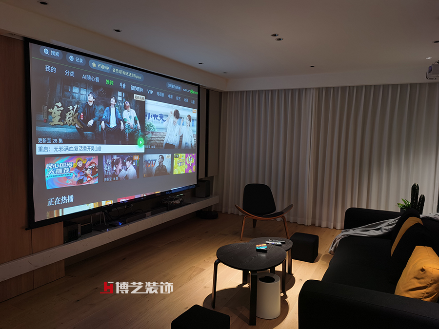 用一部電影來放松疲憊之后的靈魂。木質+白色背景,搭配深色軟裝,濃淡相宜。