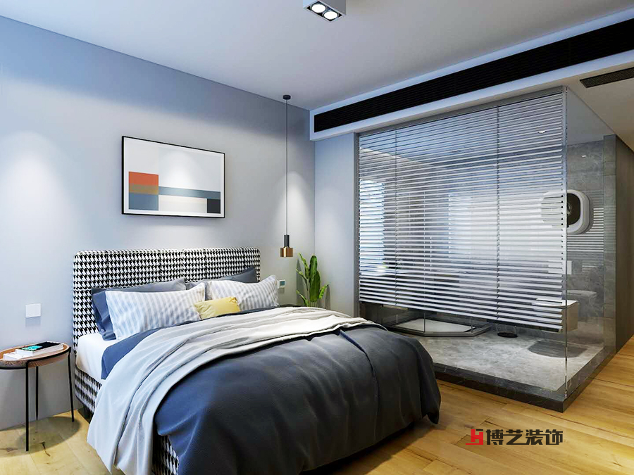 主衛做玻璃隔斷,搭配莫蘭迪灰色墻面,吊一盞金屬床頭燈,時尚、高級、質感,都市男女的生活畫卷躍然而出。