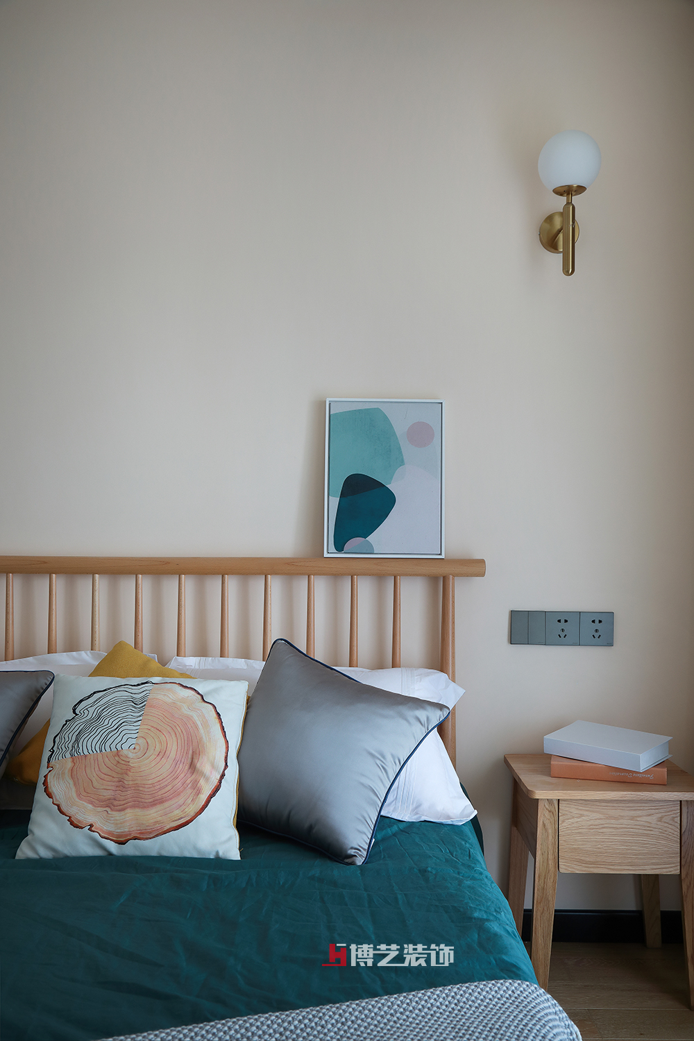 次臥用陽光的顏色搭配湖藍的四件套,細膩又溫暖,將來做兒童房又不減可發(fā)揮的空間。