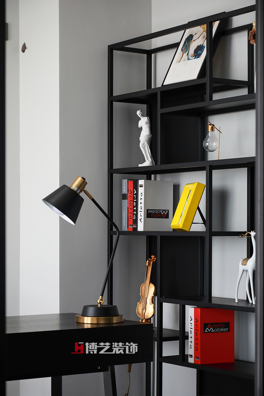 落地窗保證了書房的采光,黑色簡約的博古架兼收納與展示,隱隱又有了幾分書香氣。