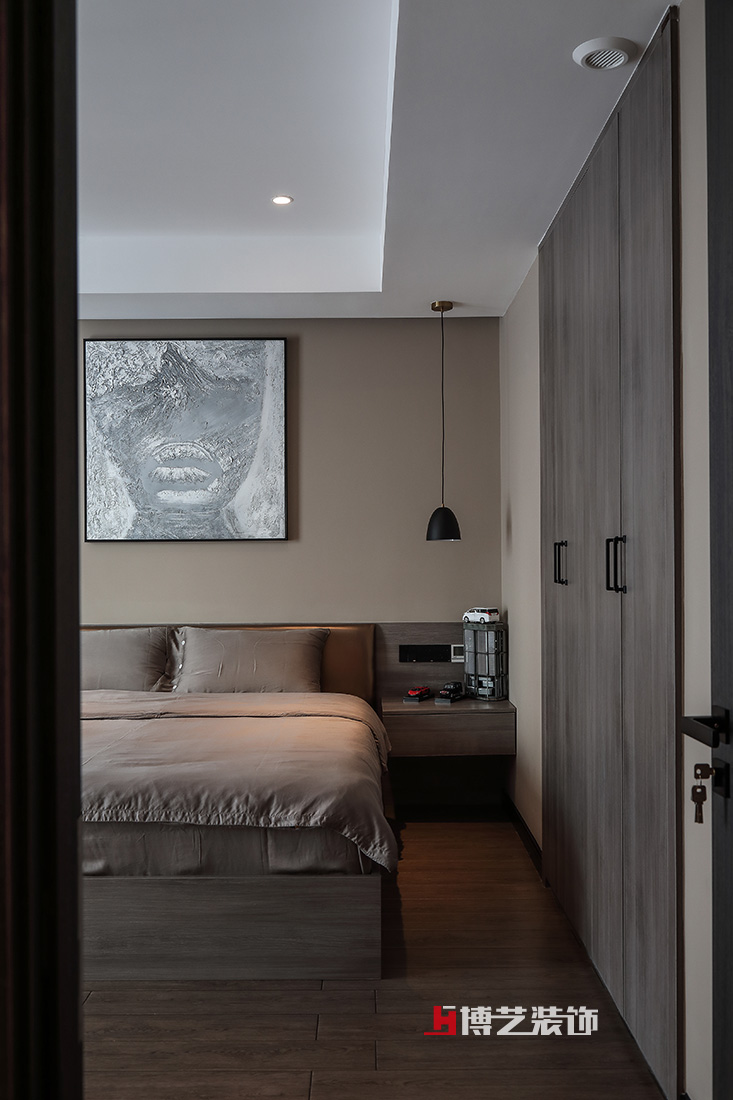 臥室采用藍灰色墻面,搭配棕色木飾面與地毯,軟硬結合,彰顯主人氣質。紅色電視隔斷又調整了空間的亮度,搭配簡單的軟裝,不繁瑣,不簡單。