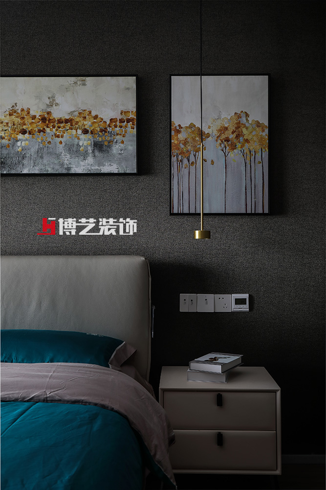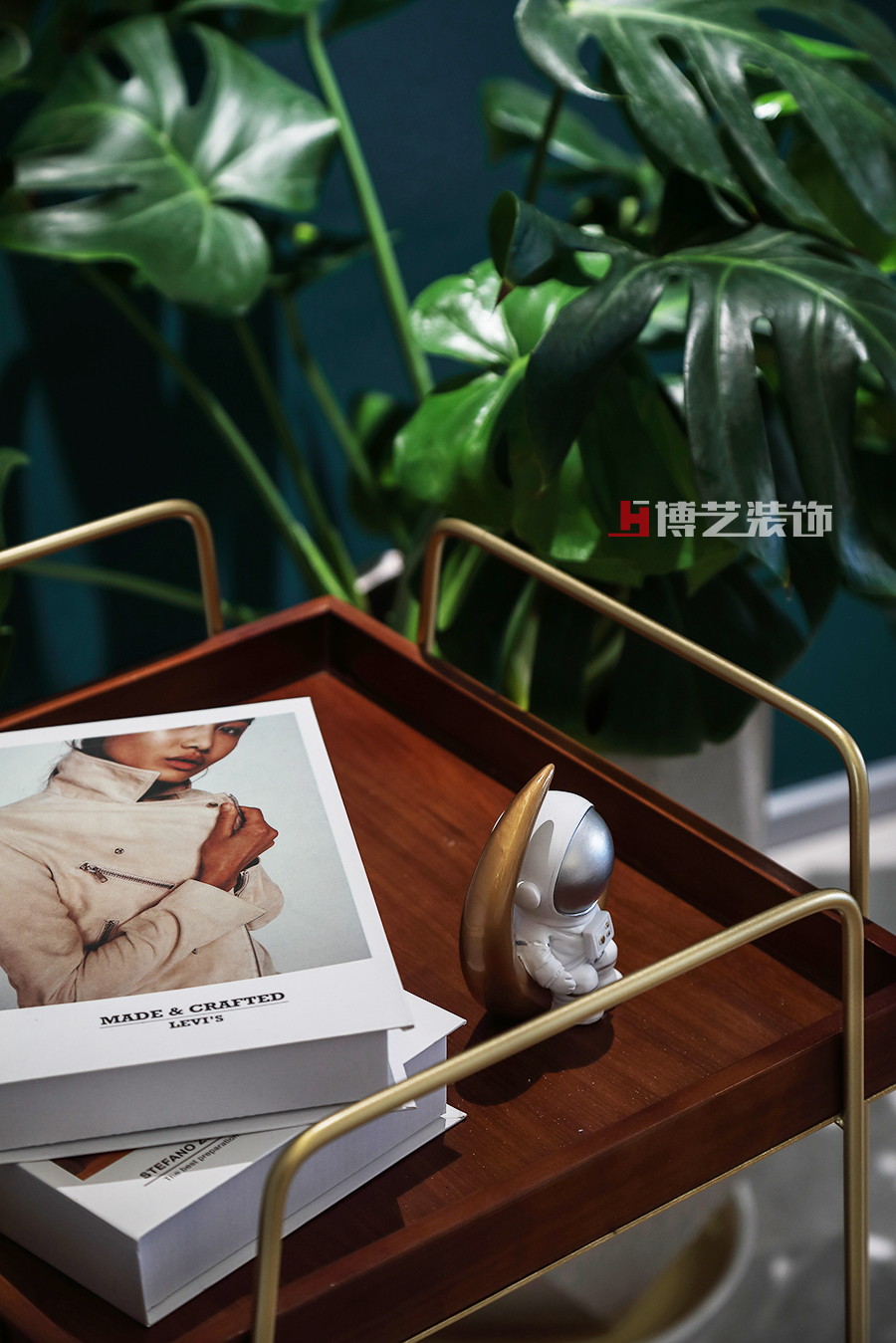 搭配著的軟裝,在墨綠的映襯下,紅色更艷,黃色更燦,文藝輕奢的滿滿格調(diào)。