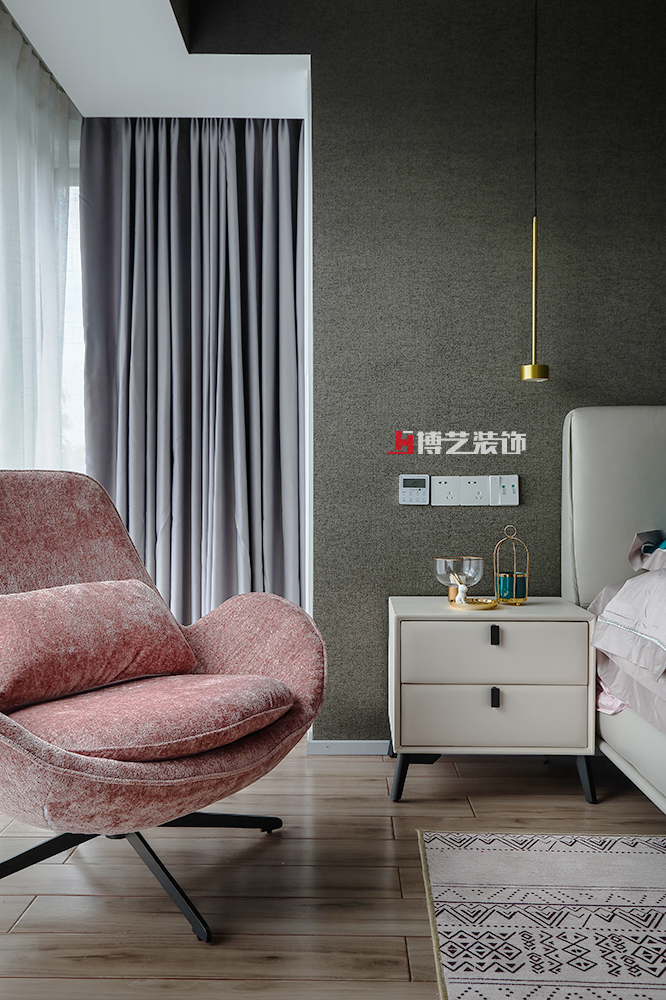 灰色的臥室營造著慵懶的舒適感,搭配的綠色床品,增添了一抹靈動,仿佛在墨色中跳躍的精靈。