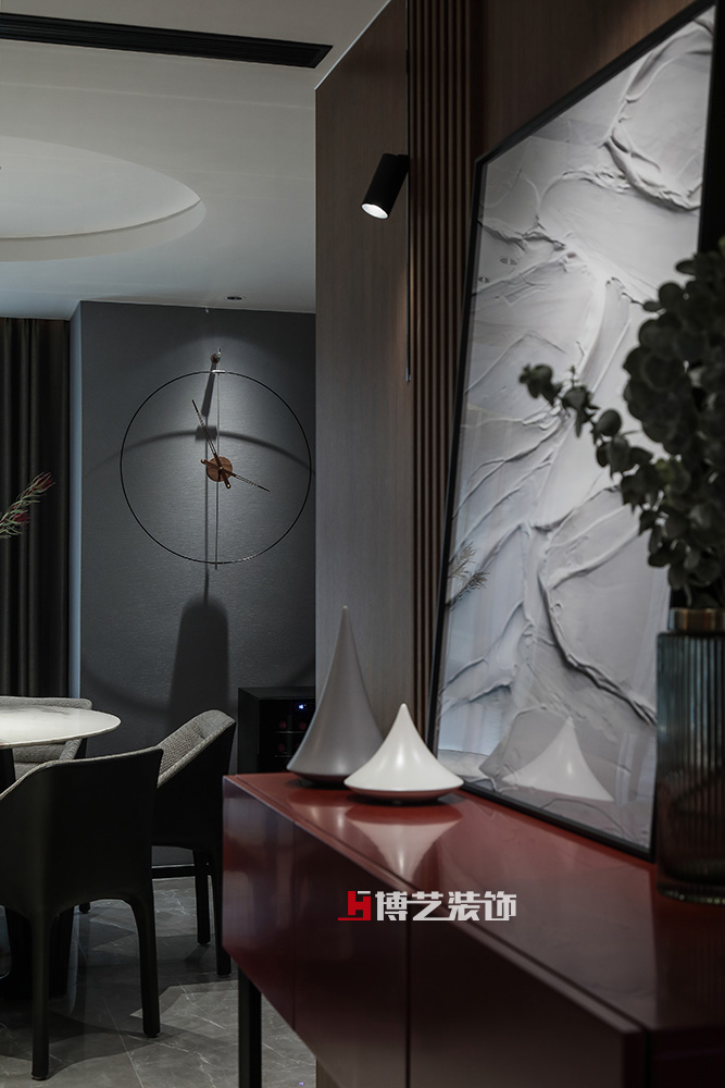 我們總認為進門的那一刻要有充分的歸家的儀式感,木質(zhì)的基調(diào),白與黑的點睛,紅與白的沖擊,讓玄關(guān)成為客餐廳的分割點,也是進門后的緩沖帶。