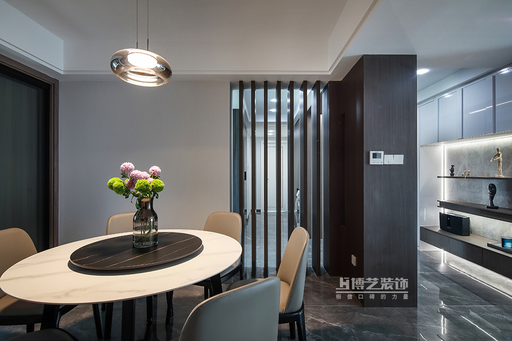 木飾面的格柵,隔而不斷,延伸視線,在視覺上增加空間感,橘色暖光帶來的是家人圍桌而餐的溫馨與其樂融融的幸福,摒棄外在的修飾,你就是你。