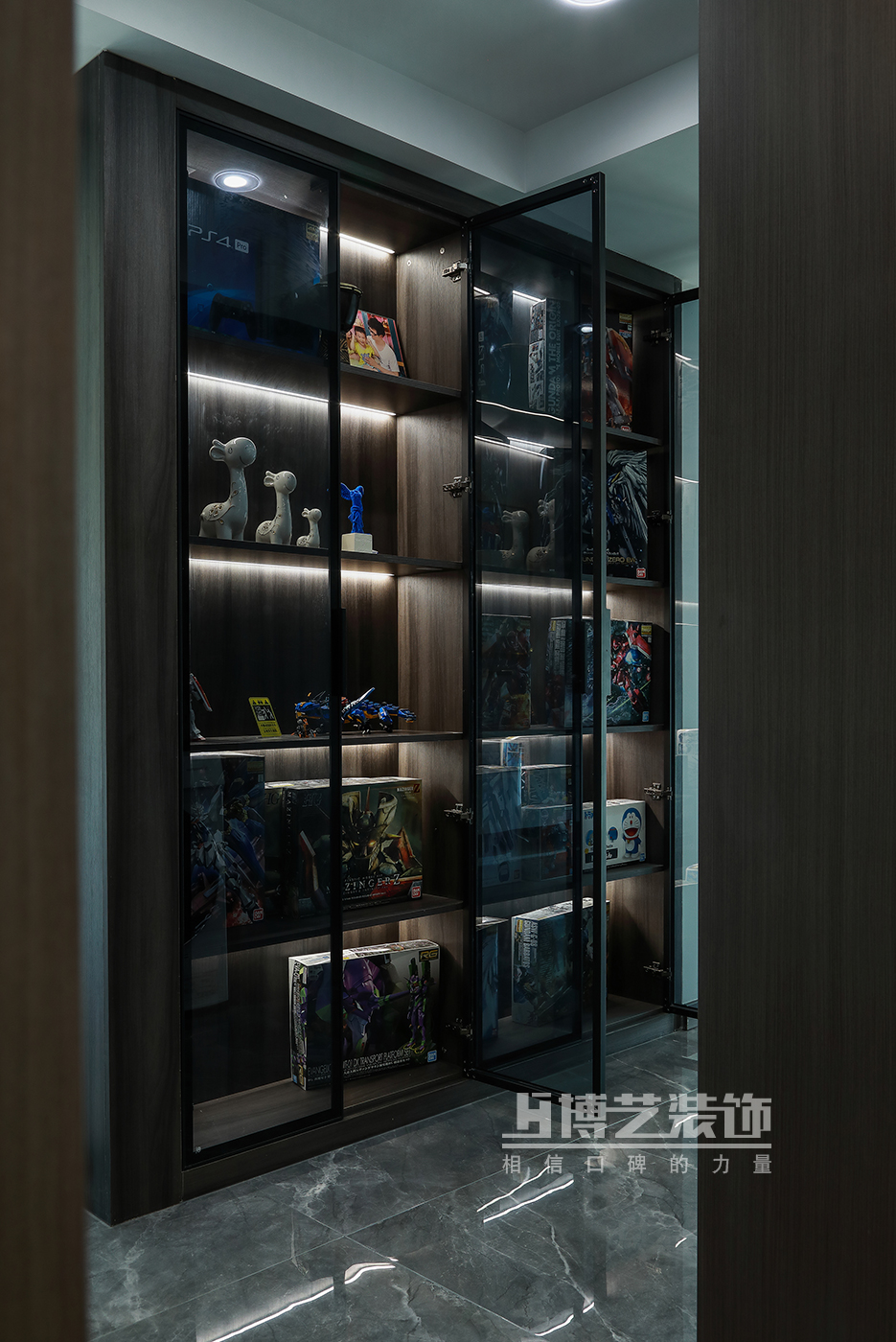 質樸的白,黑胡桃的黑,視覺上的對比,平衡空間的質量。木材刻在骨子里的溫潤是藏品最好的陪襯,燈光照耀的是你珍而重之之物,更是你成長的軌跡。