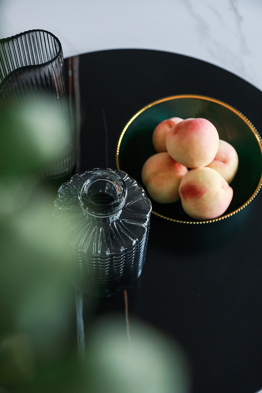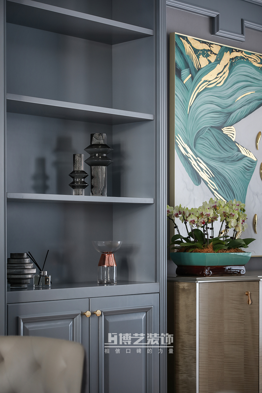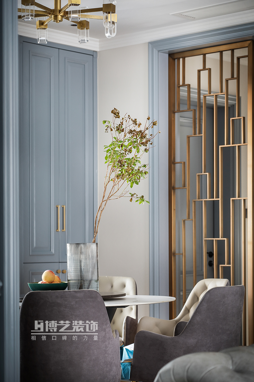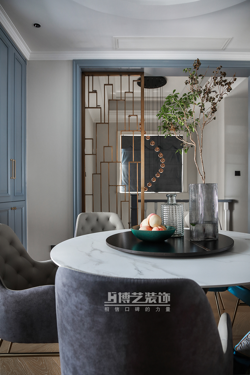 利用空間制作的一組藍灰色餐邊柜,呼應客廳,增加空間的統一性,兼具的收納及展示功能更具實用性。大理石餐桌搭配米色系餐椅,硬朗中帶著柔情,于無聲處彰顯優雅,搭配桌邊精致的隔斷,金屬的質感提升整體格調。