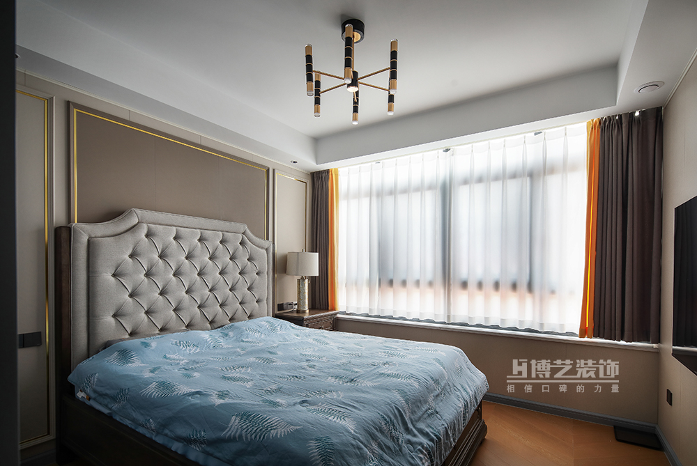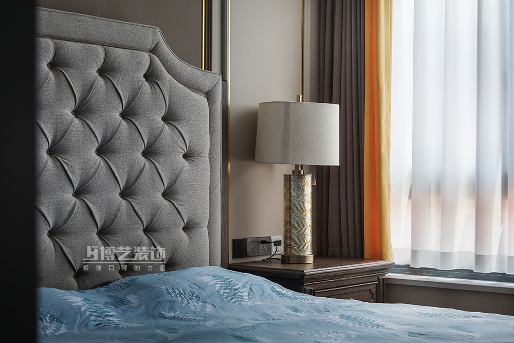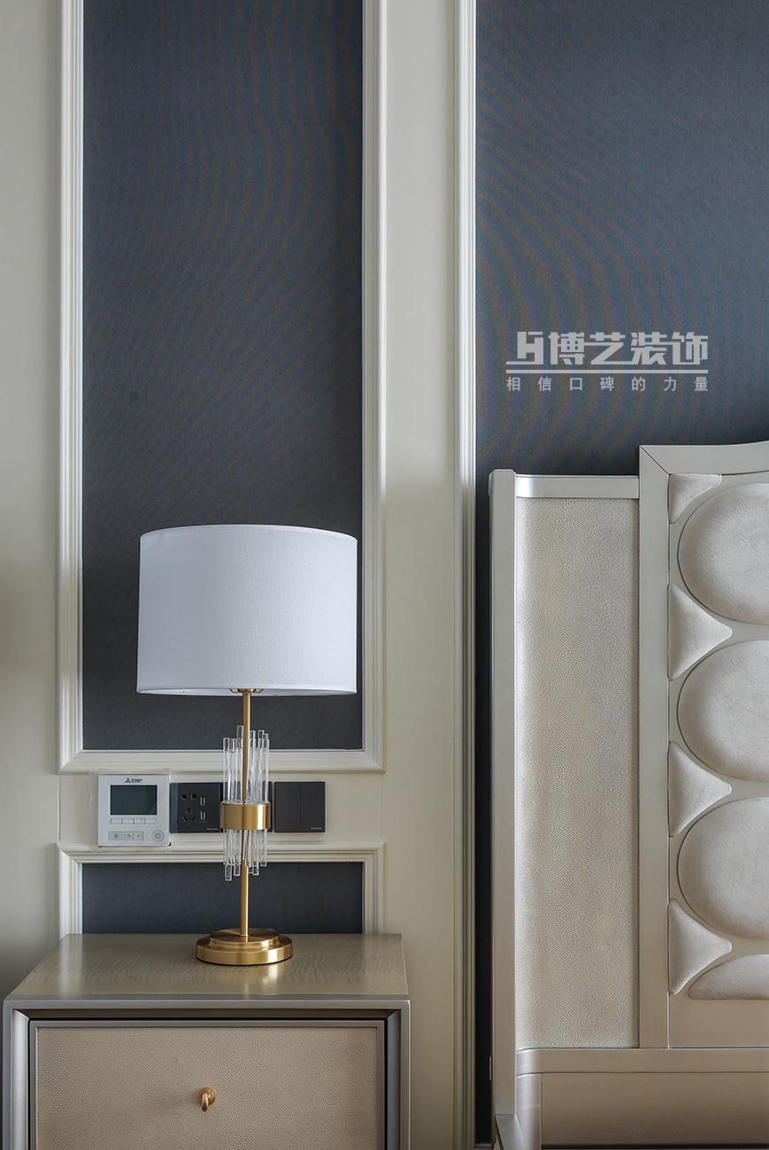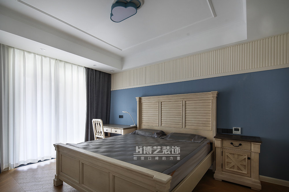 拼色的背景墻往外舒展,延伸視覺,澄凈的藍色與白色搭配,塑造美好素靜的居室氛圍,木質的床頭增添了幾分質樸的氣息,安靜的感覺不斷擴散。